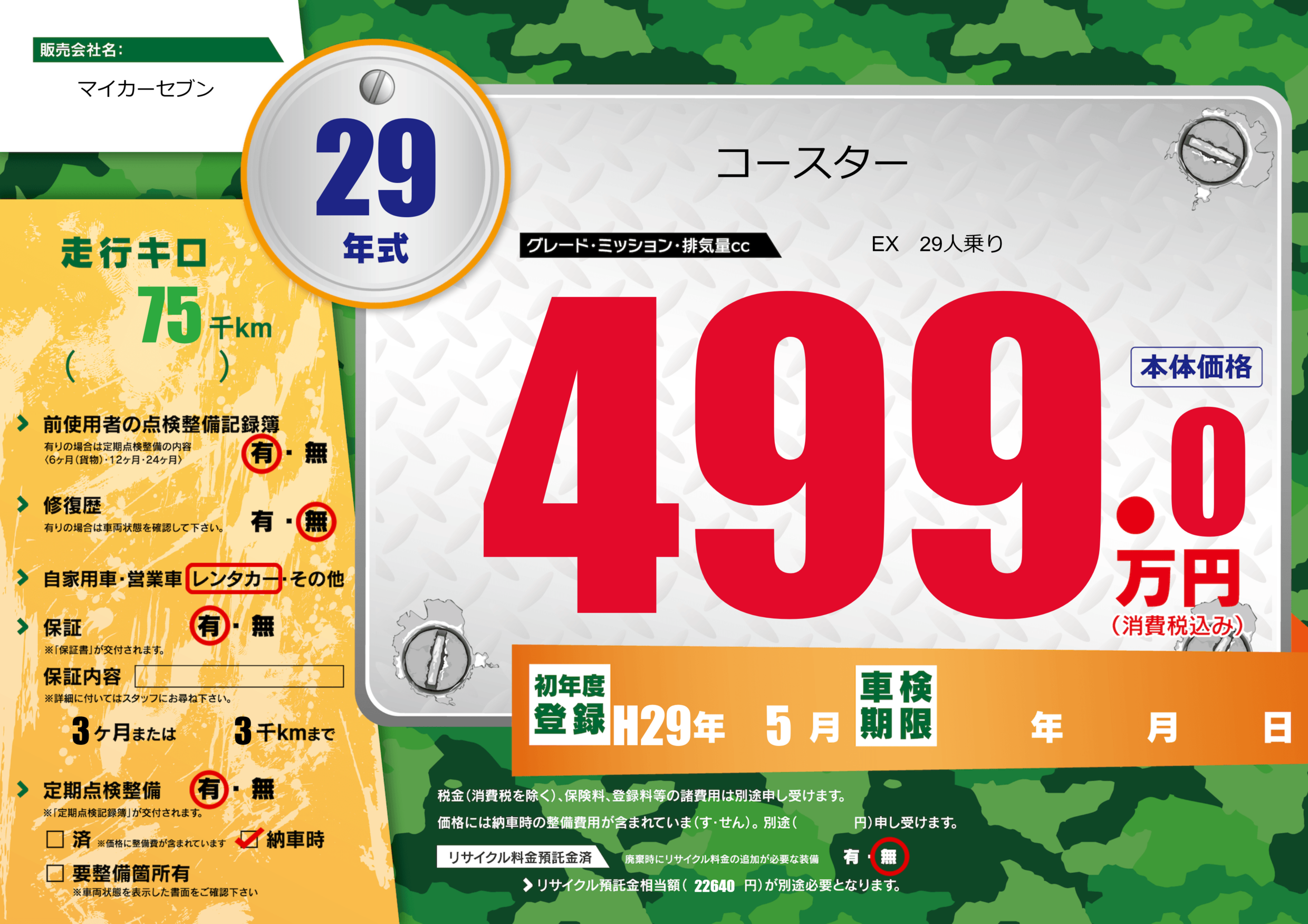 | 走行キロ | 7.5万km | 初年度登録 | H29年5月 |