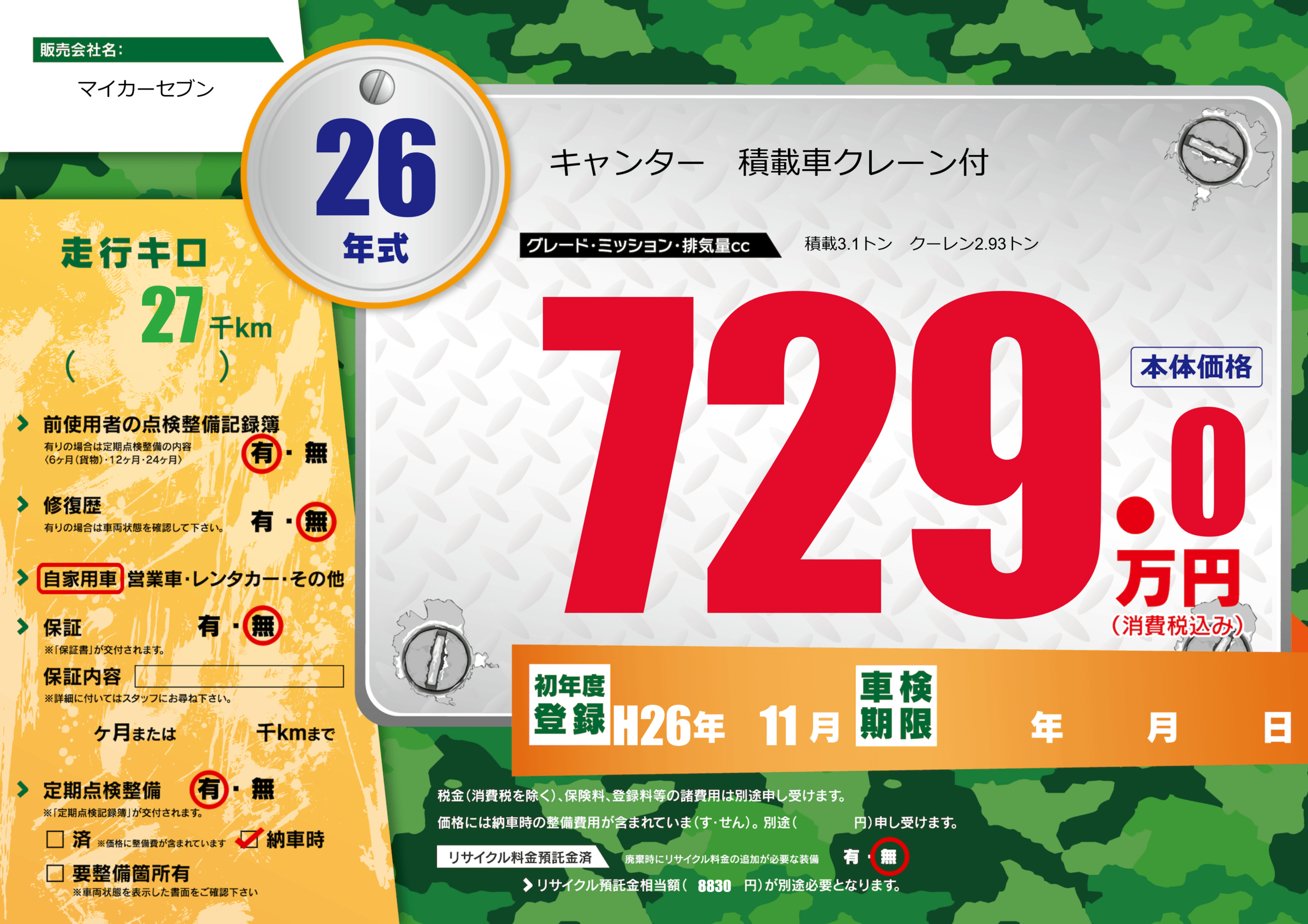 | 車名 | キャンター 積載車クレーン付 | グレード ミッション 排気量 |