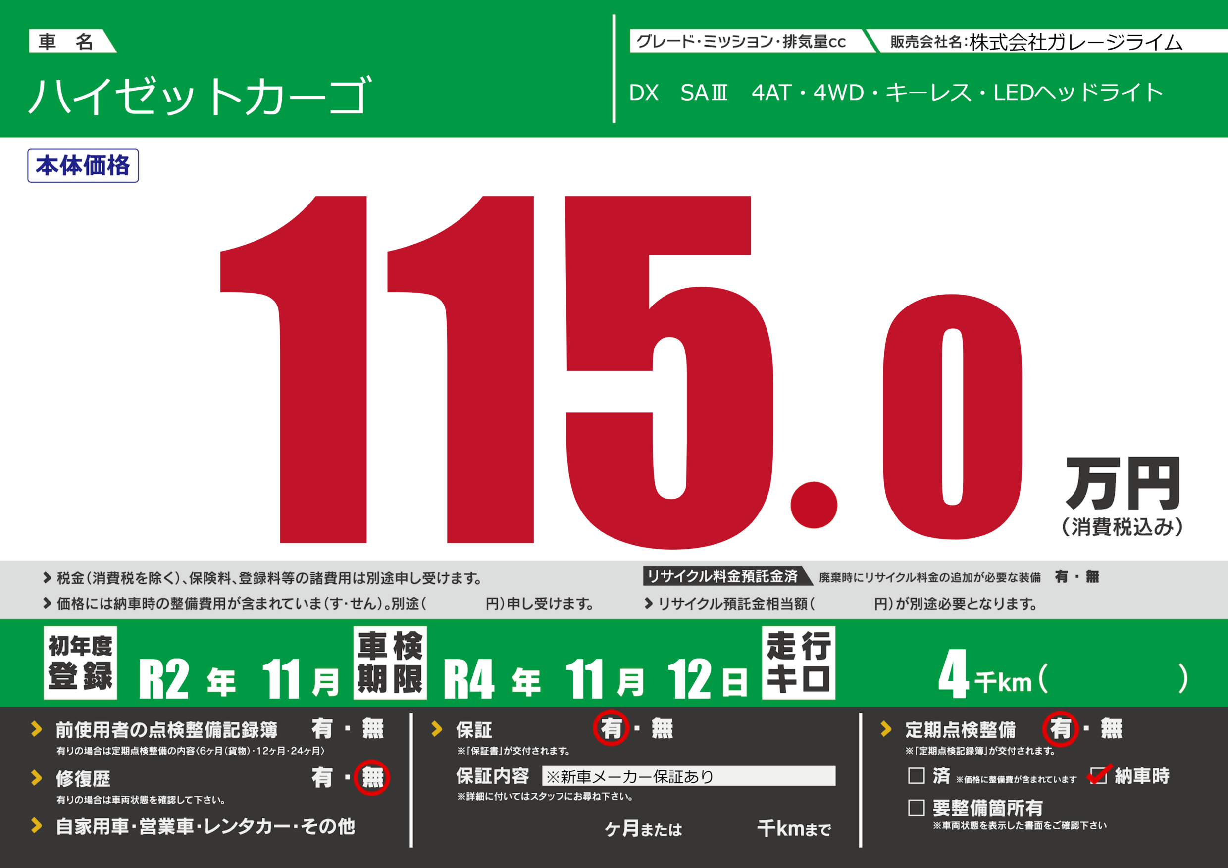 なし | 車検制限 | R4年11月12月 |