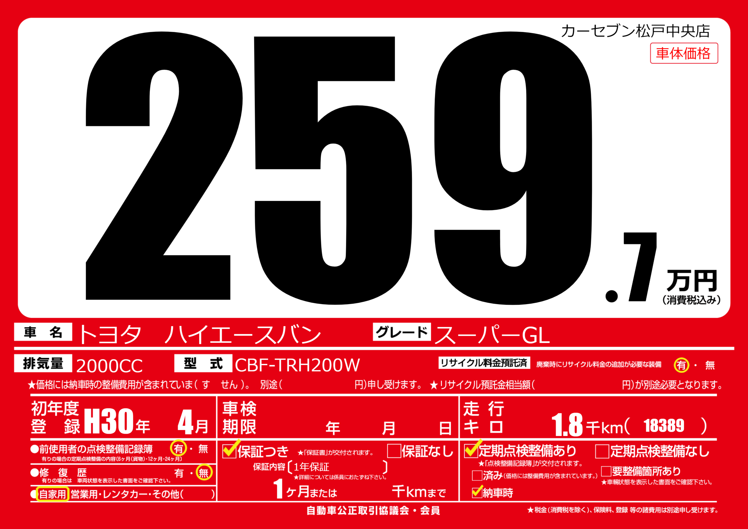 | 車名 | トヨタ ハイエースバン | グレード ミッション 排気量 |