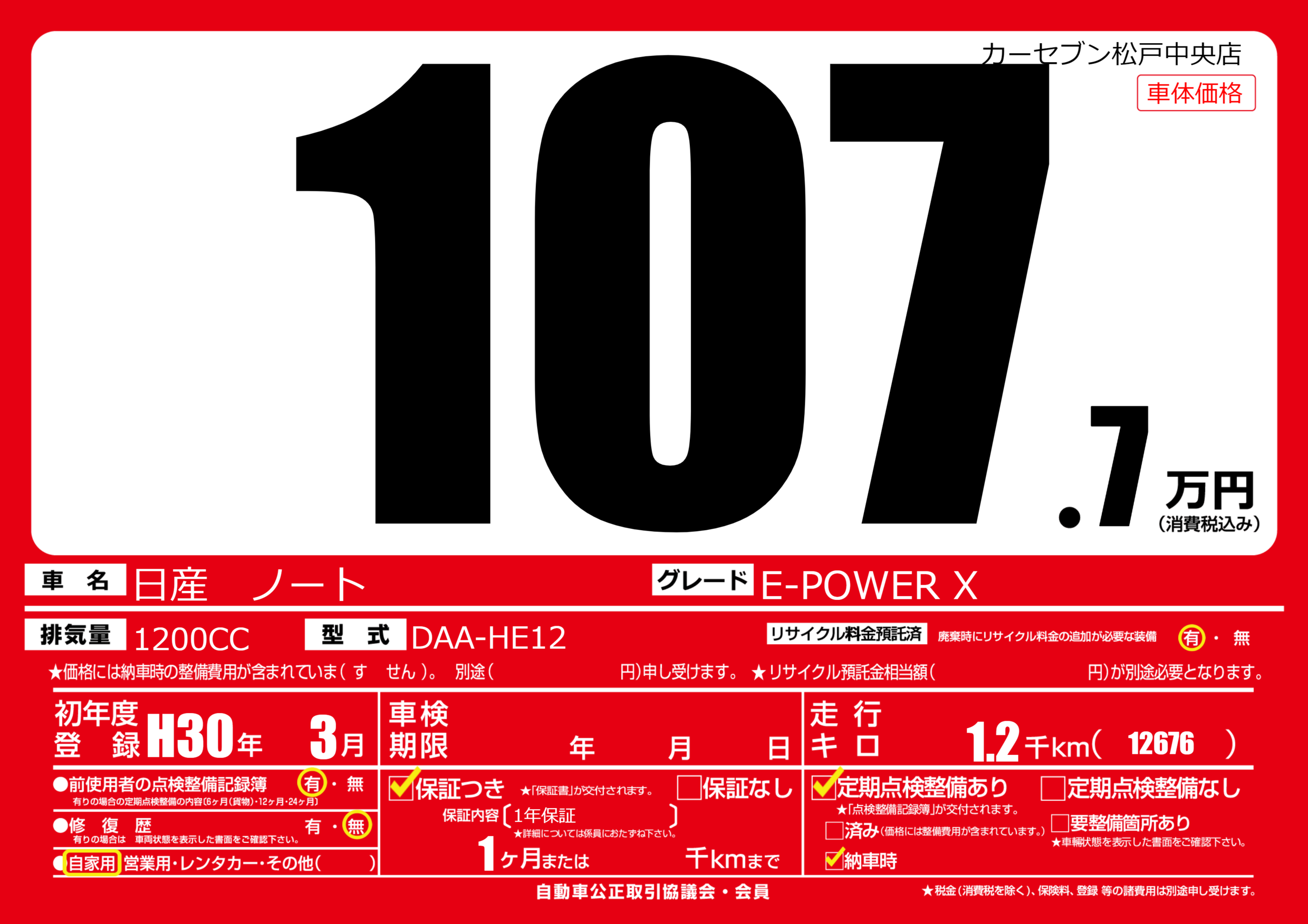 | 定期点検整備 | 定期点検整備あり 納車時あり | ||