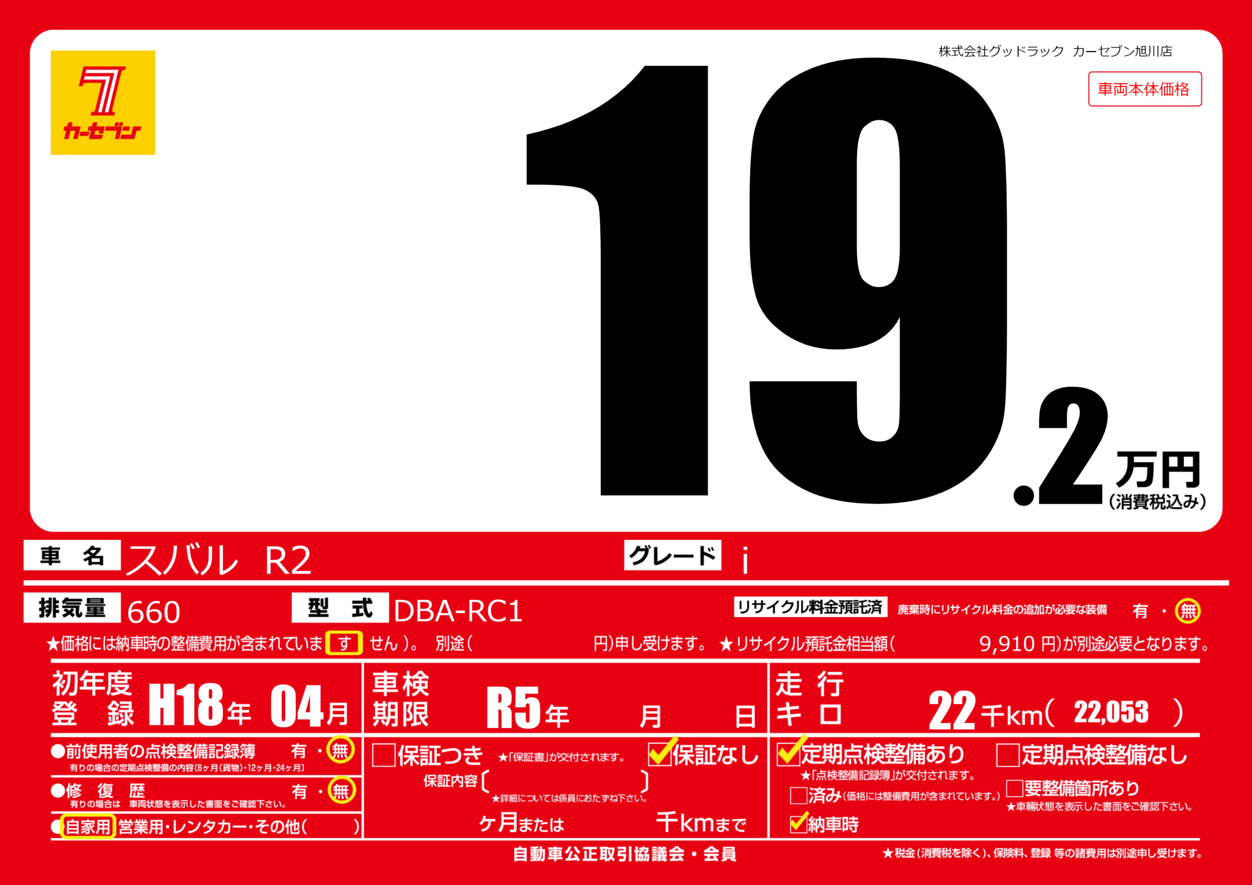 | 車名 | スバル R2 | グレード ミッション 排気量 |
