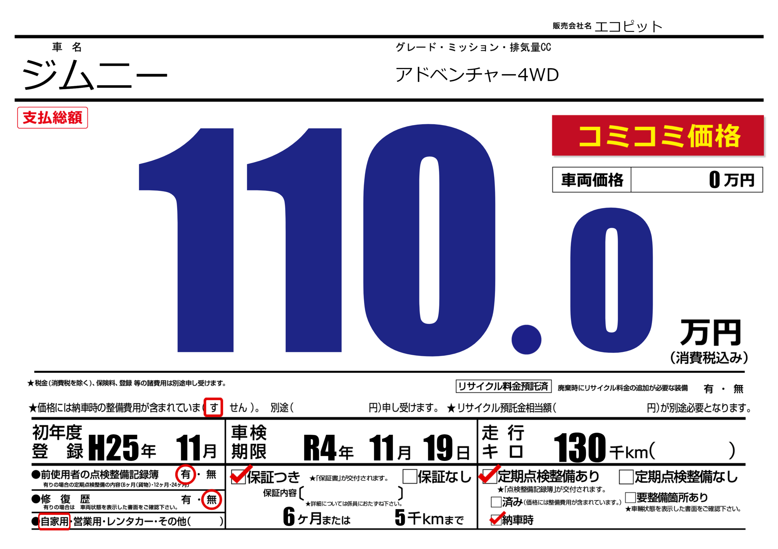 | 車名 | ジムニー | グレード ミッション 排気量 |