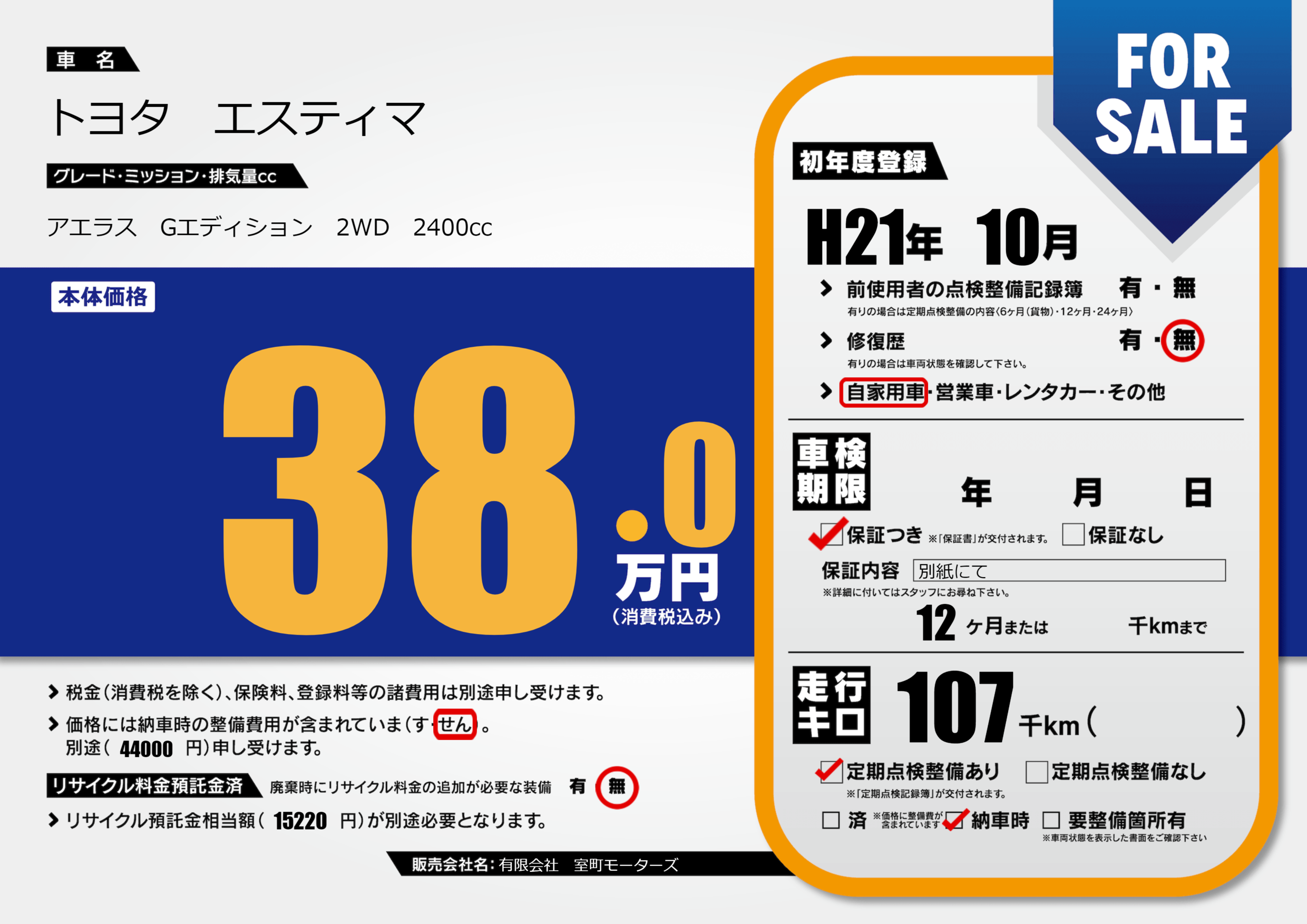 | 車名 | トヨタ エスティマ | グレード ミッション 排気量 |