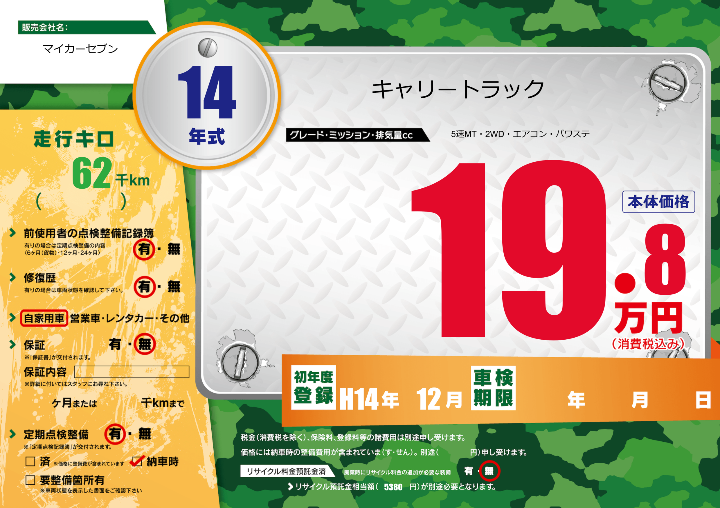 | 車名 | キャリートラック | グレード ミッション 排気量 |