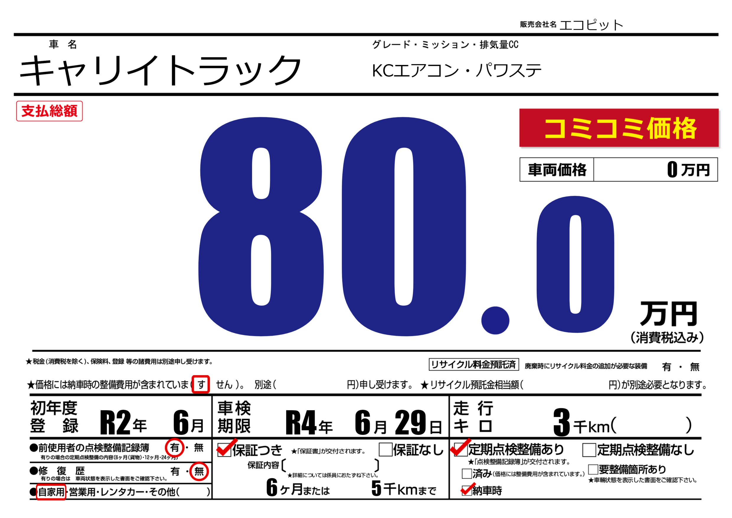 | 車名 | キャリイトラック | グレード ミッション 排気量 |