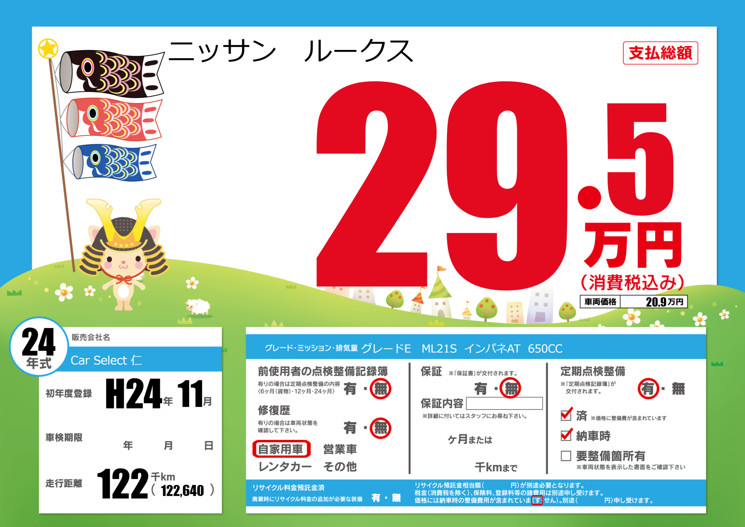 | 定期点検整備 | 定期点検整備あり 定期点検整備済み 納車時あり | ||