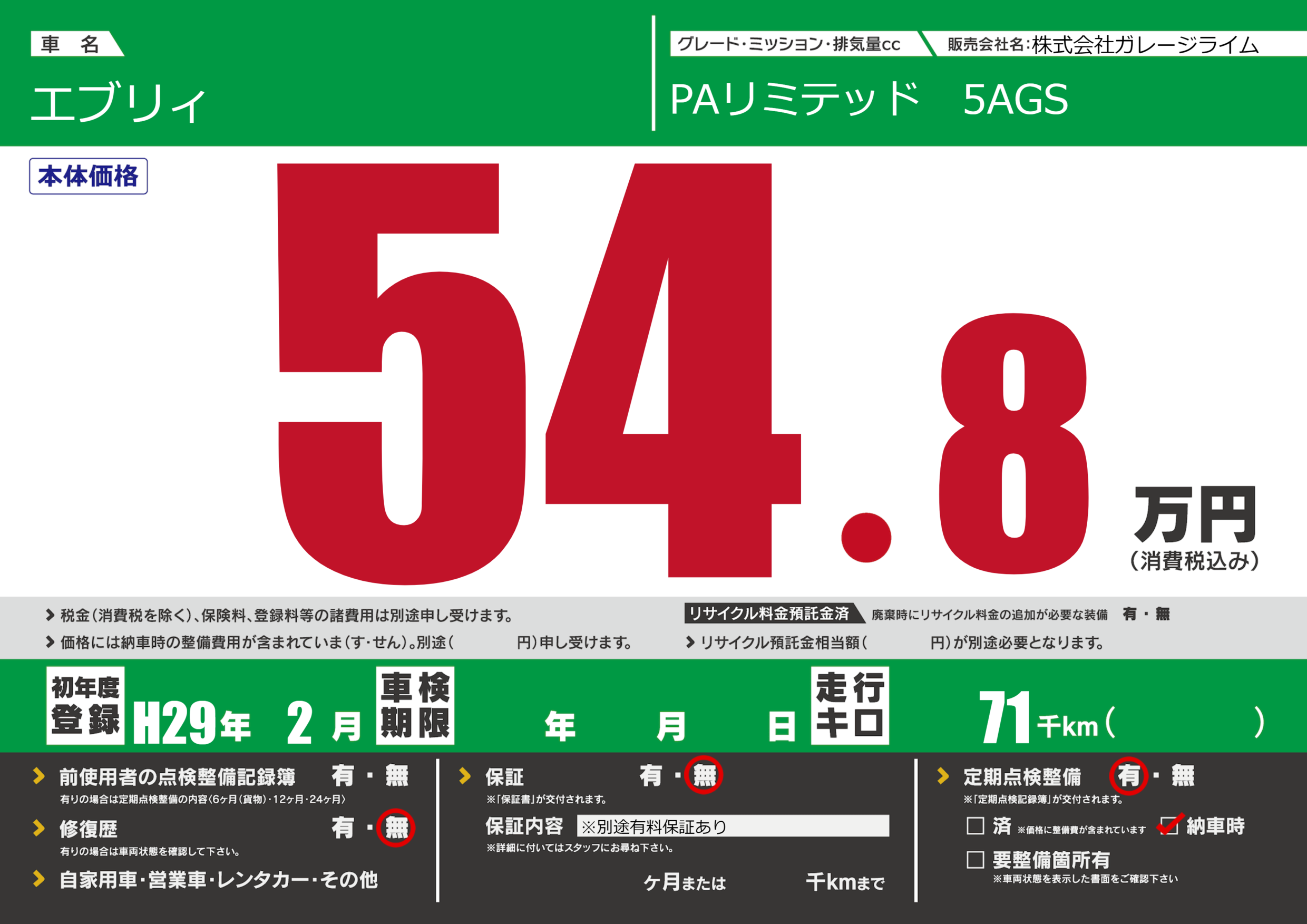 | 車名 | エブリィ | グレード ミッション 排気量 |