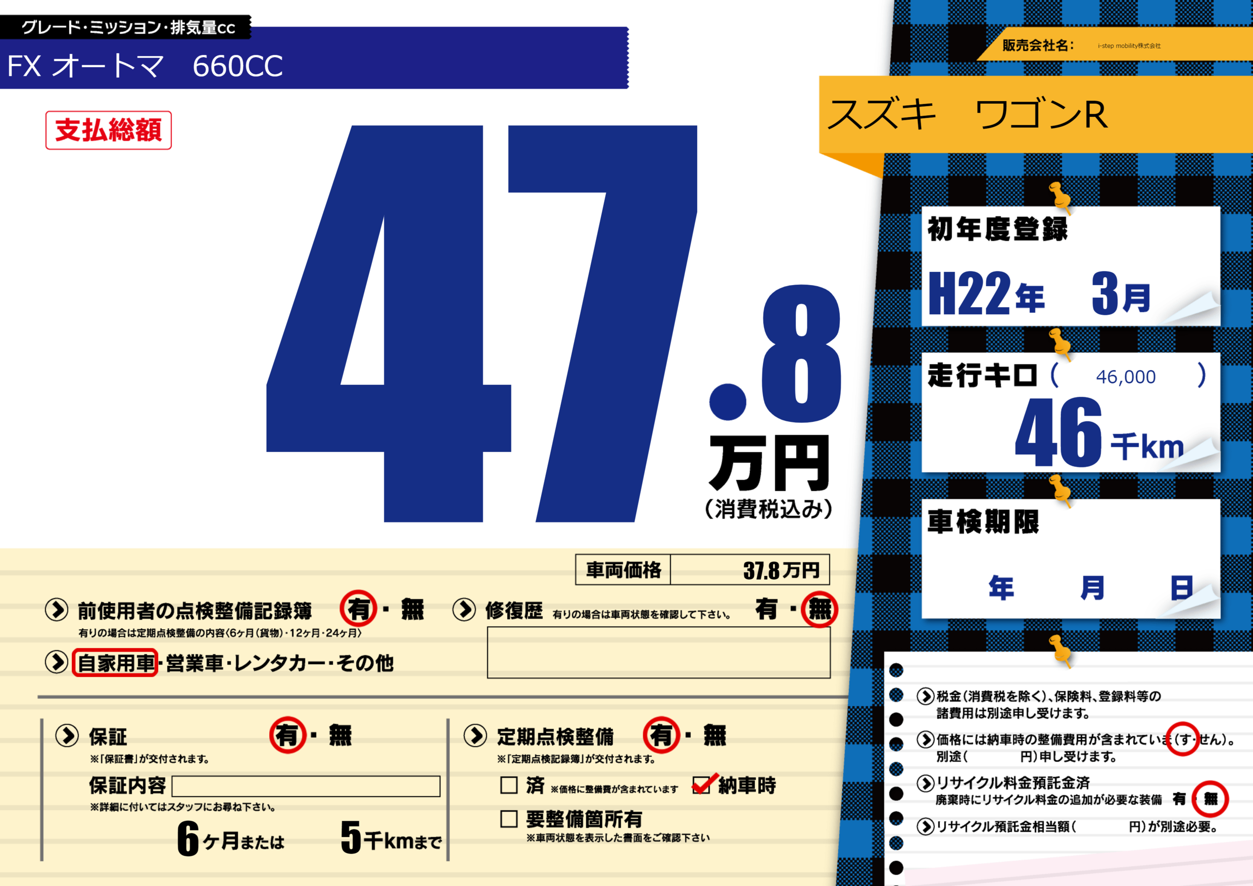 | 車名 | スズキ ワゴンR | グレード ミッション 排気量 |