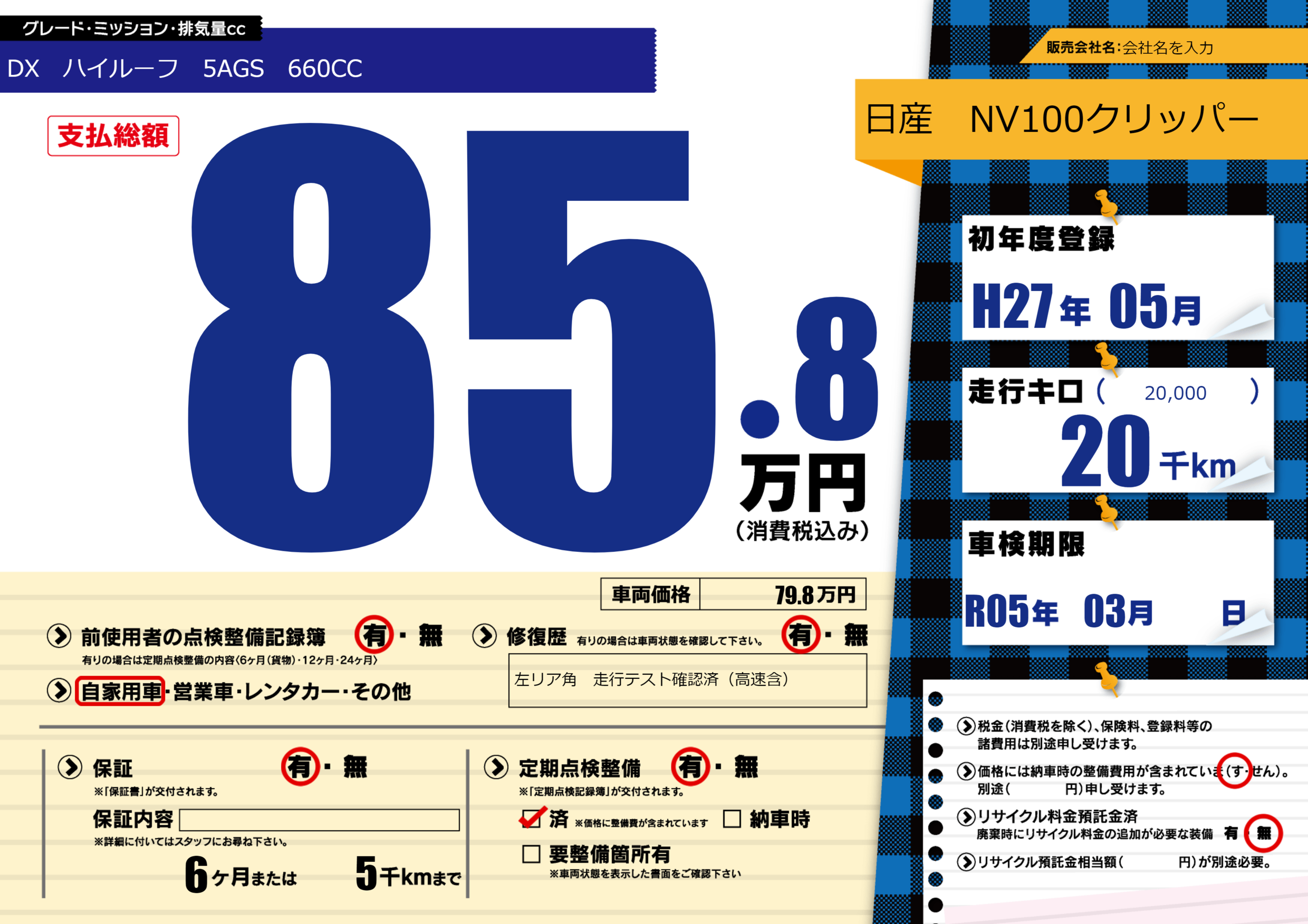 | 定期点検整備 | 定期点検整備あり 定期点検整備済み | ||