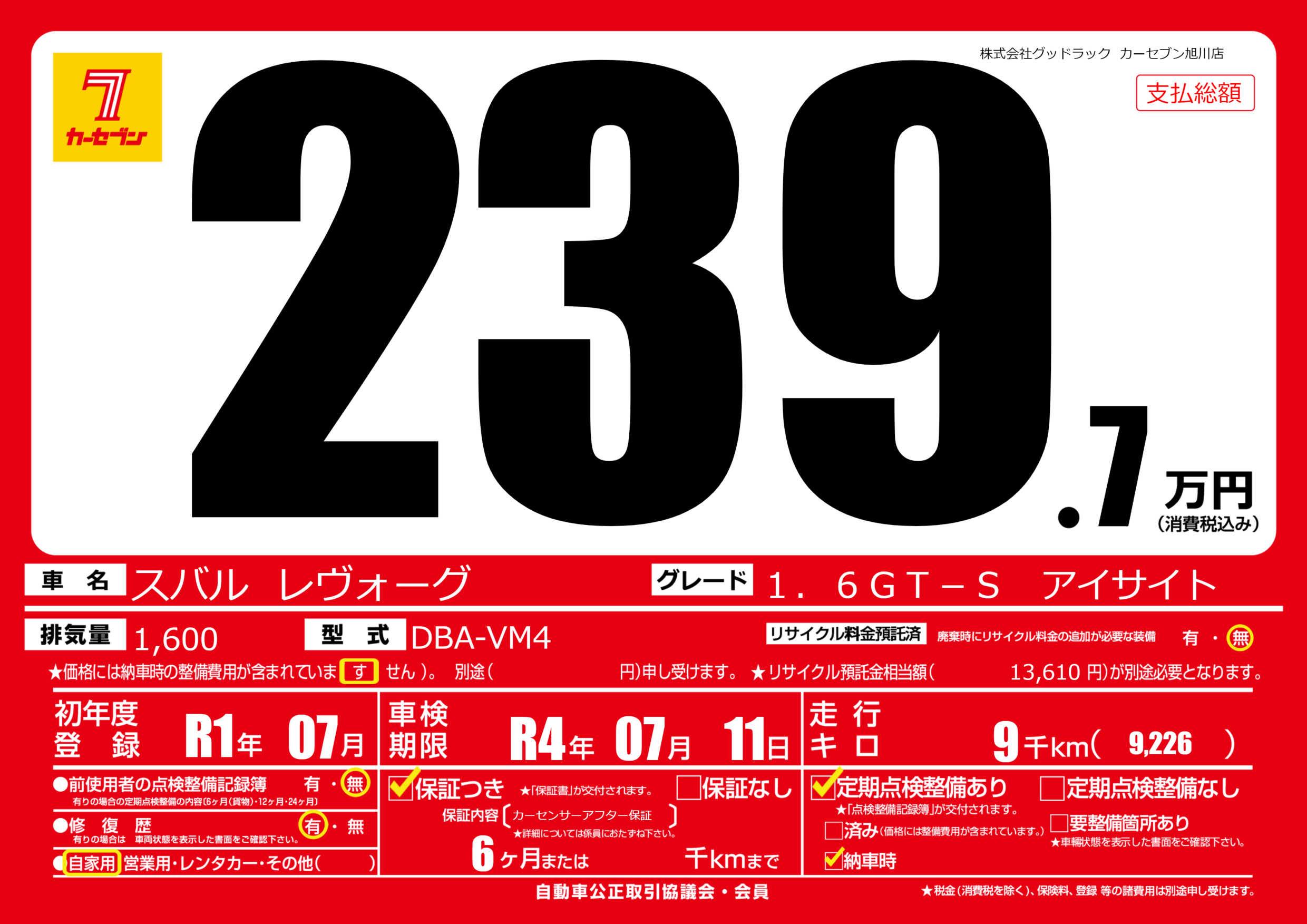 | 車名 | スバル レヴォーグ | グレード ミッション 排気量 |