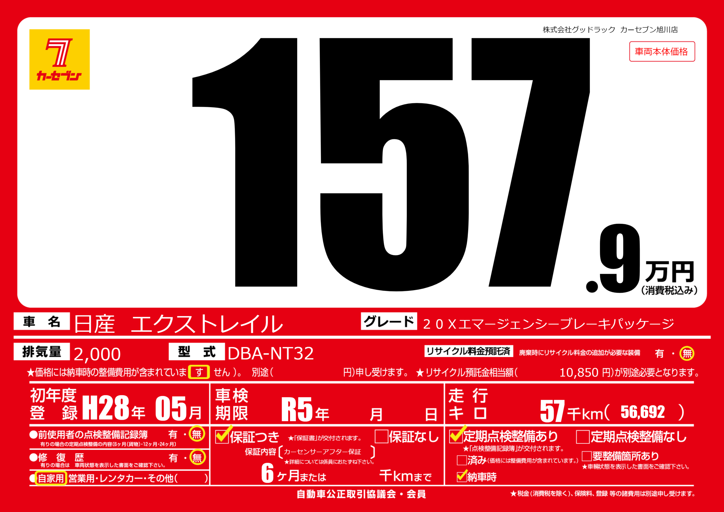 | 車名 | 日産 エクストレイル | グレード ミッション 排気量 |