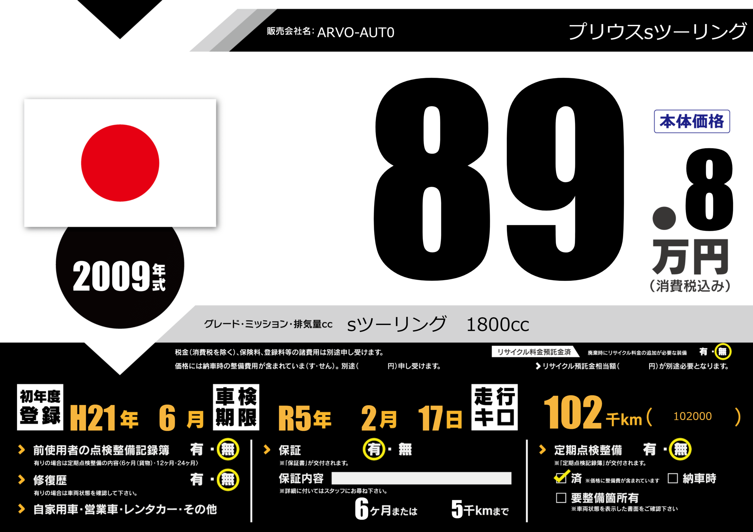 | 車名 | プリウスsツーリング | グレード ミッション 排気量 |