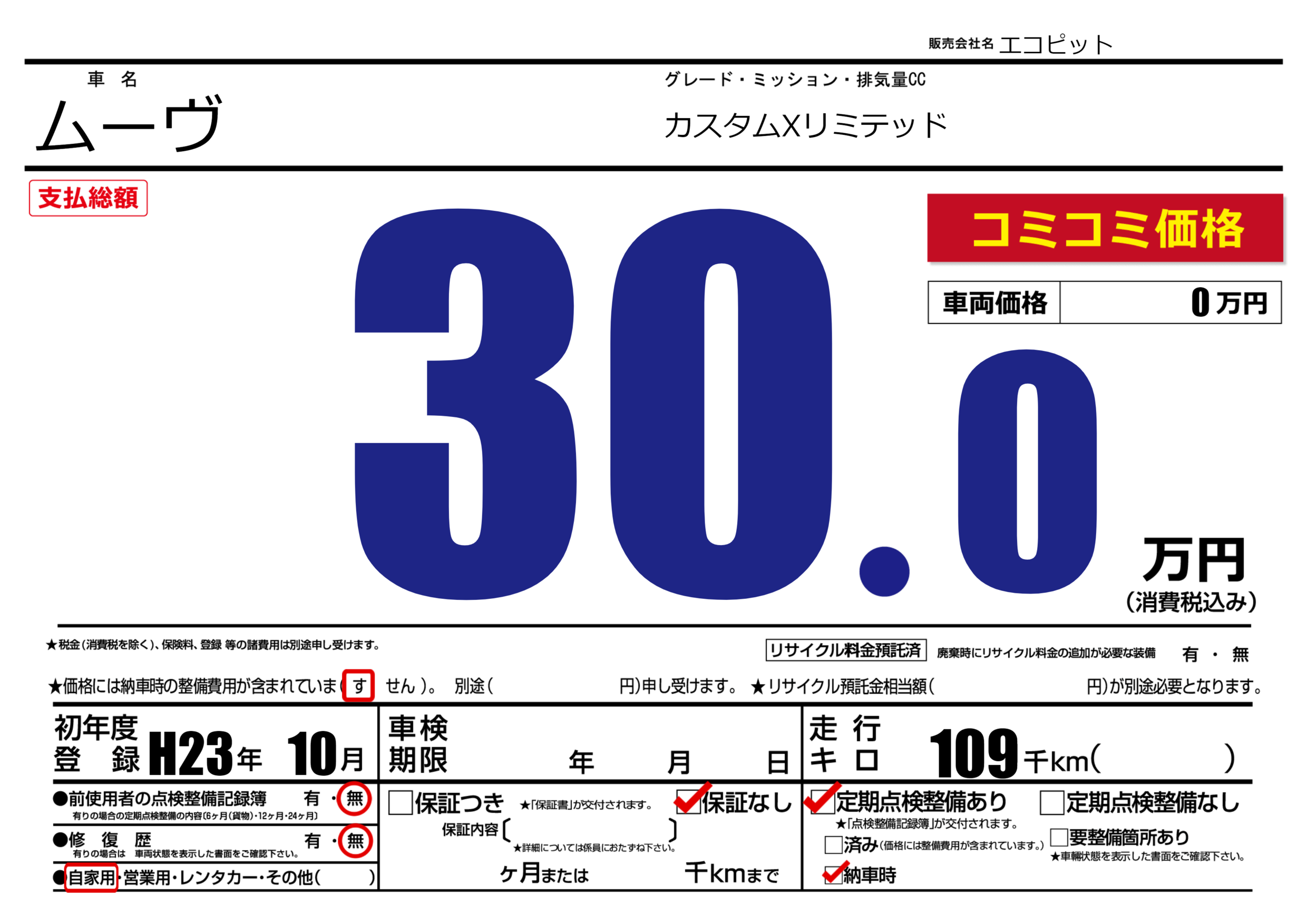 | 定期点検整備 | 定期点検整備あり 納車時あり | ||