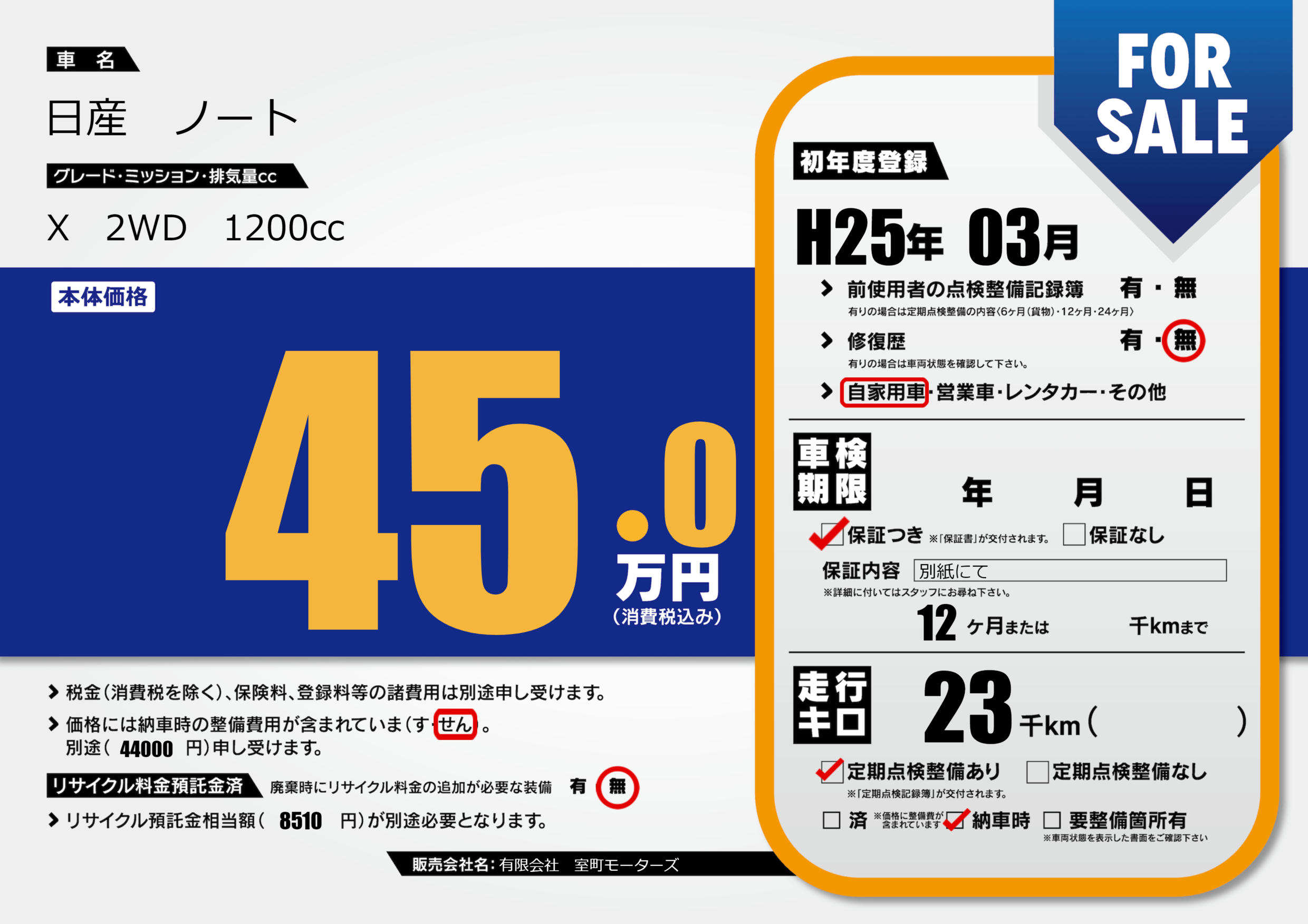 | 車名 | 日産 ノート | グレード ミッション 排気量 |