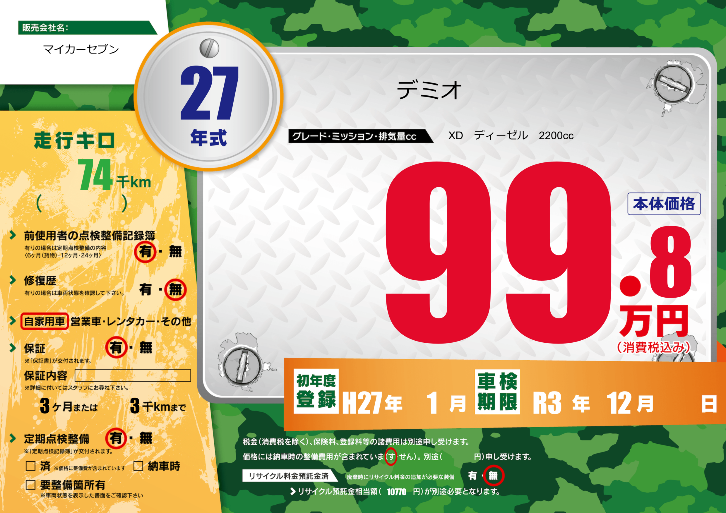 | 車名 | デミオ | グレード ミッション 排気量 |
