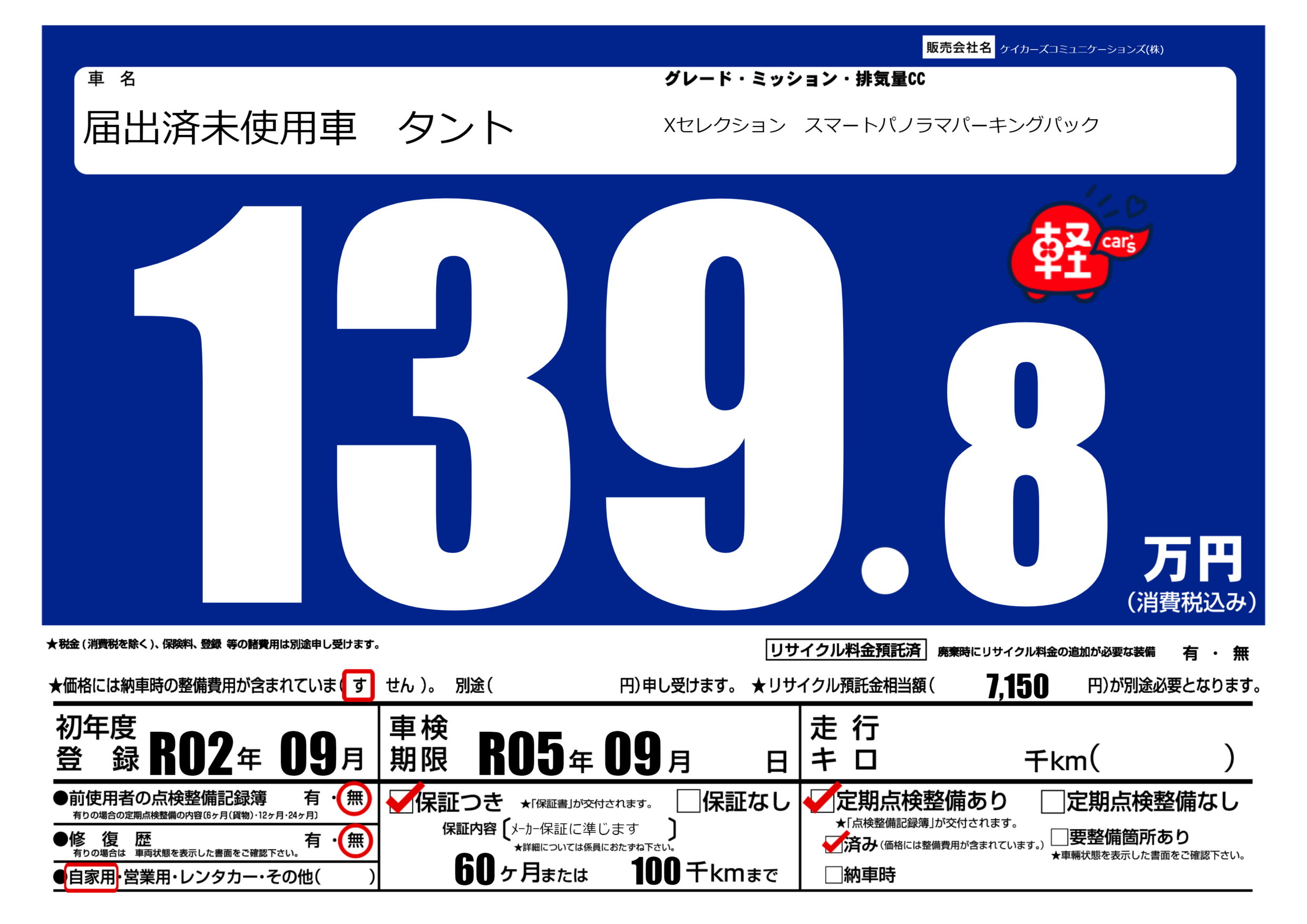 | 車名 | 届出済未使用車 タント | グレード ミッション 排気量 |
