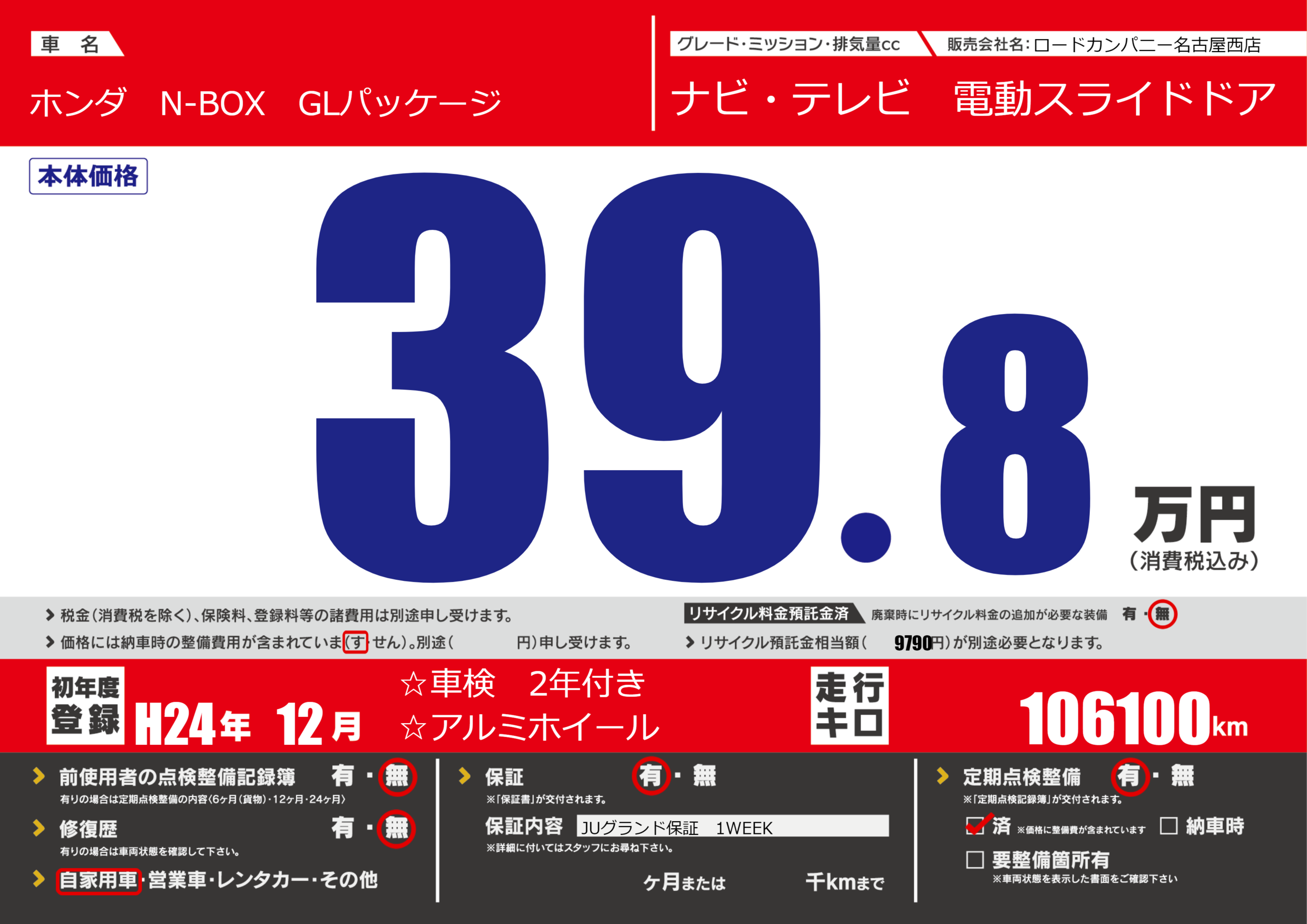 | 定期点検整備 | 定期点検整備あり 定期点検整備済み | ||