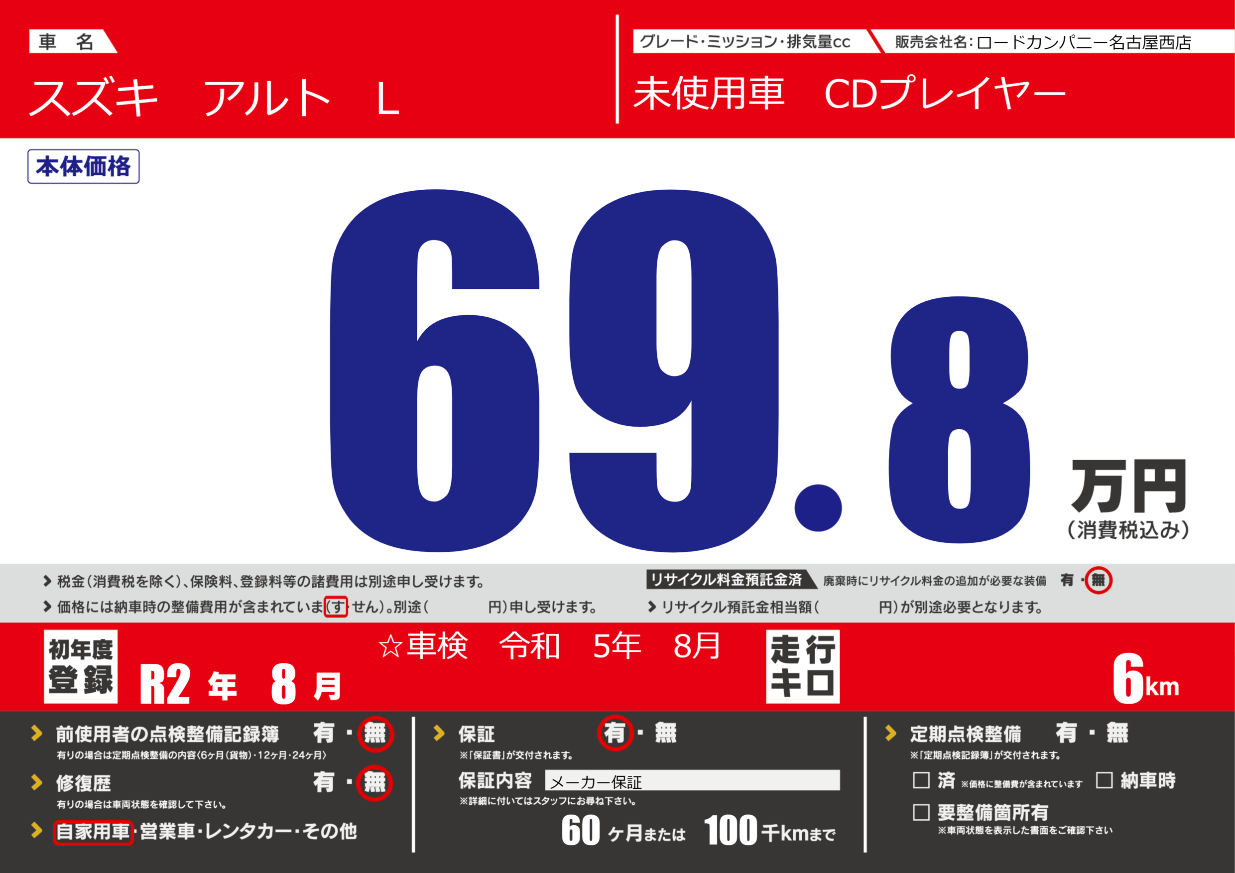 | 走行キロ | 0.6万km | 初年度登録 | R2年8月 |