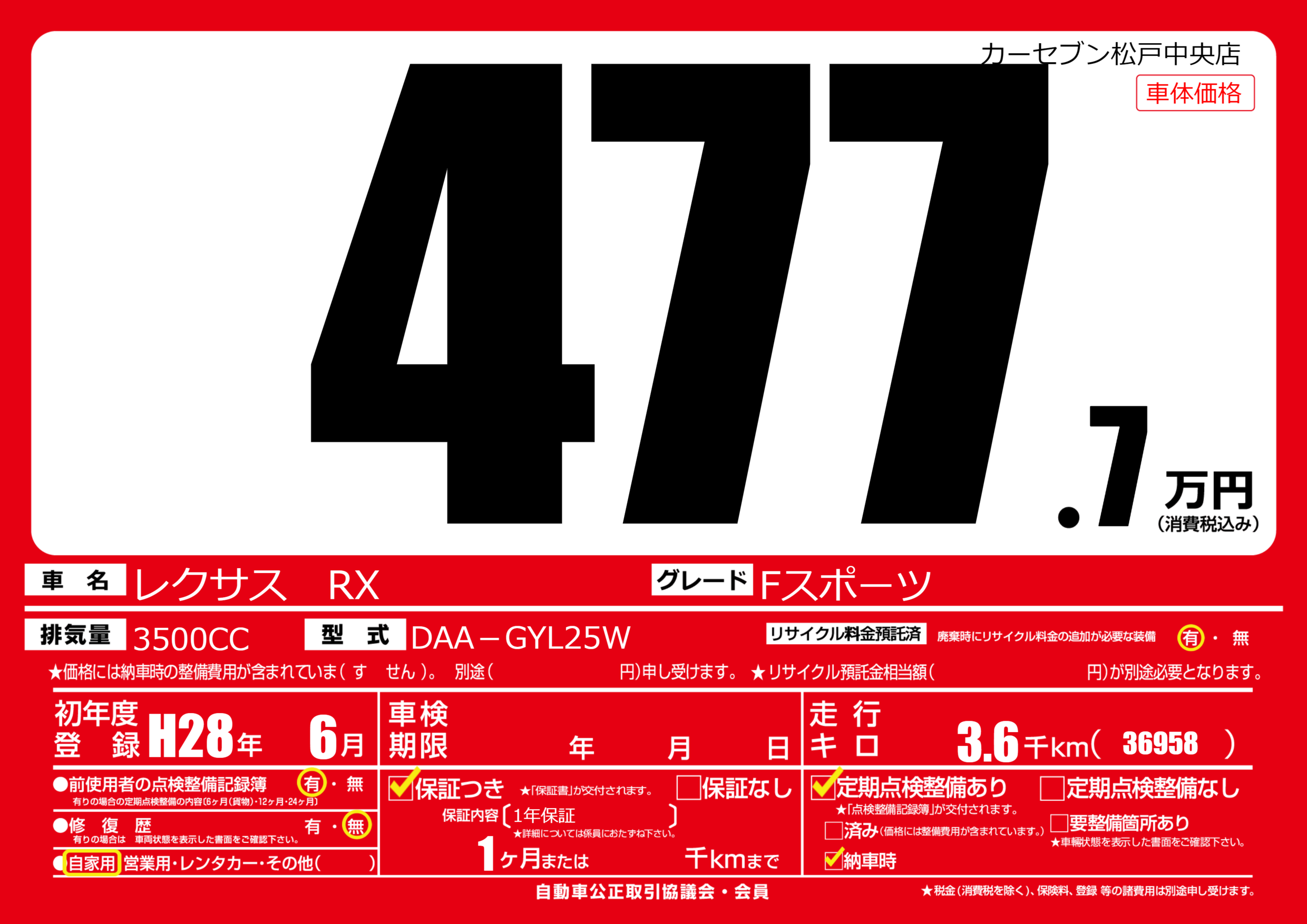 | 車名 | レクサス RX | グレード ミッション 排気量 |
