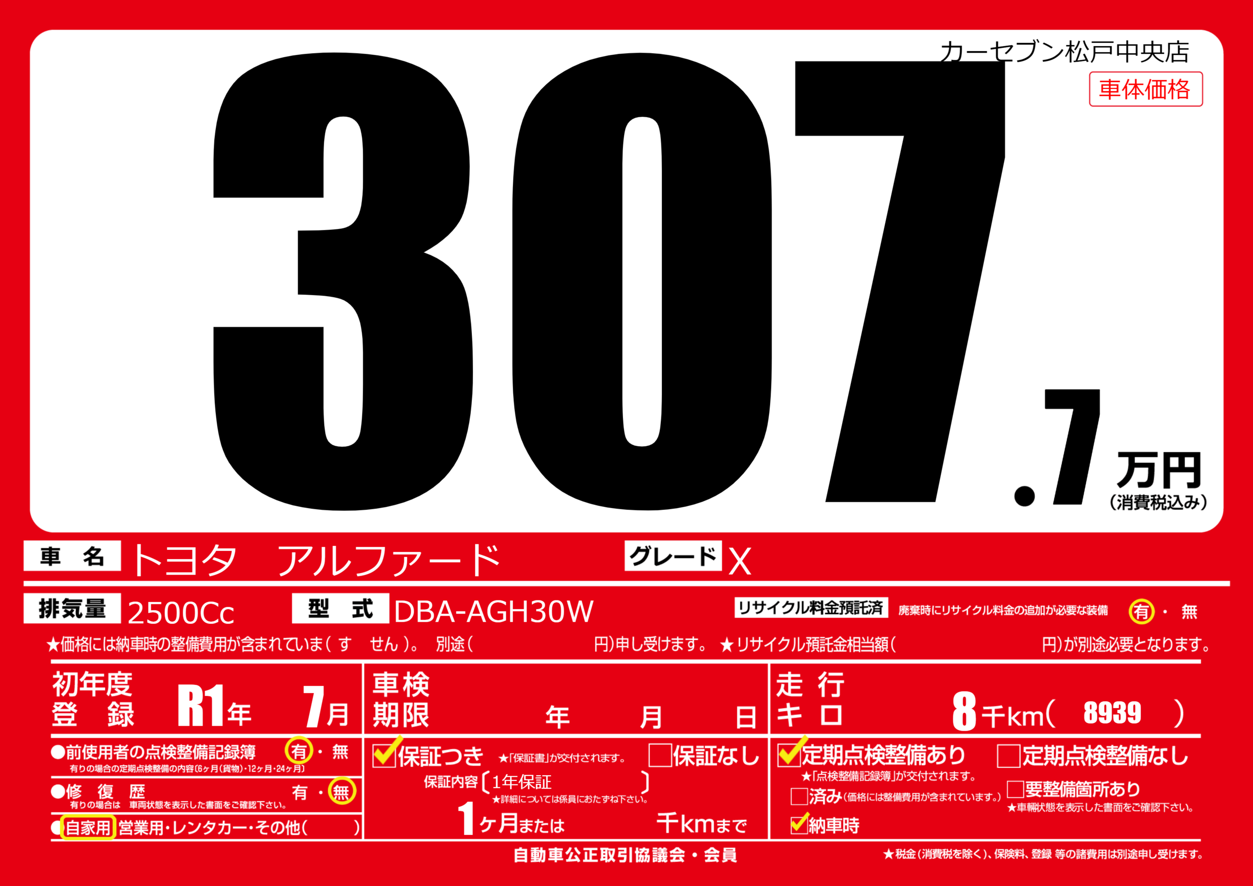 | 車名 | トヨタ アルファード | グレード ミッション 排気量 |