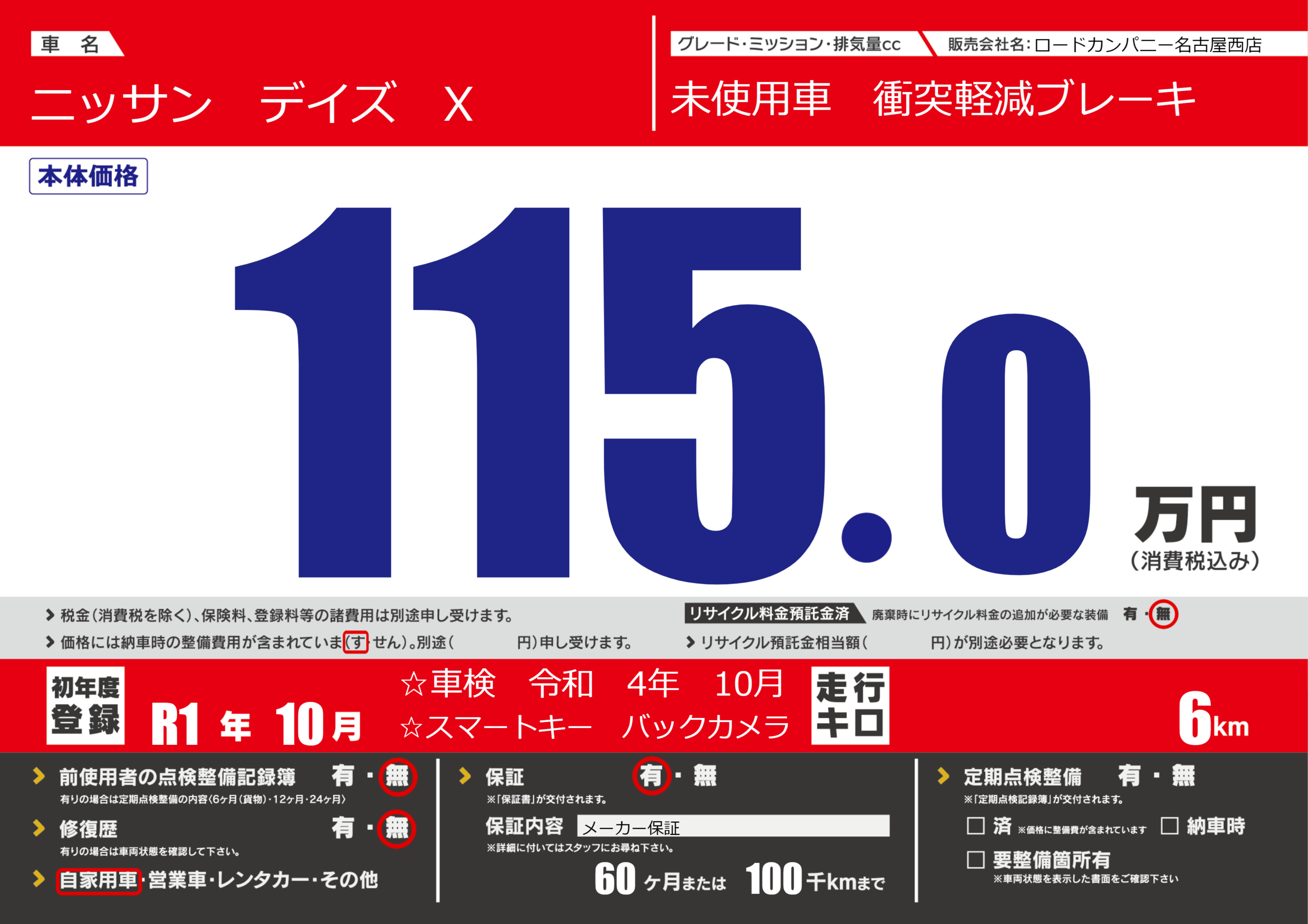 | 車名 | ニッサン デイズ X | グレード ミッション 排気量 |
