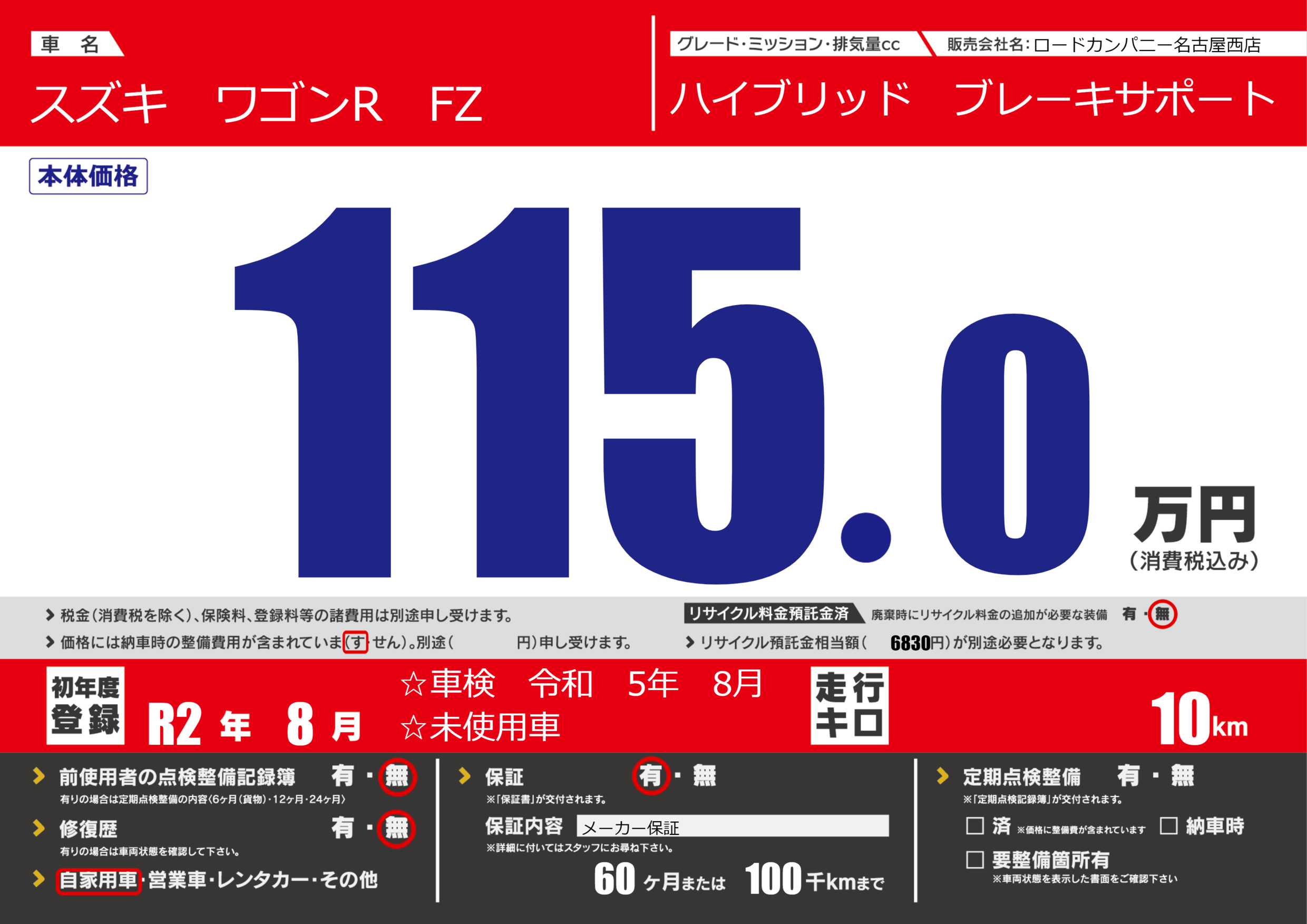 | 車名 | スズキ ワゴンR FZ | グレード ミッション 排気量 |