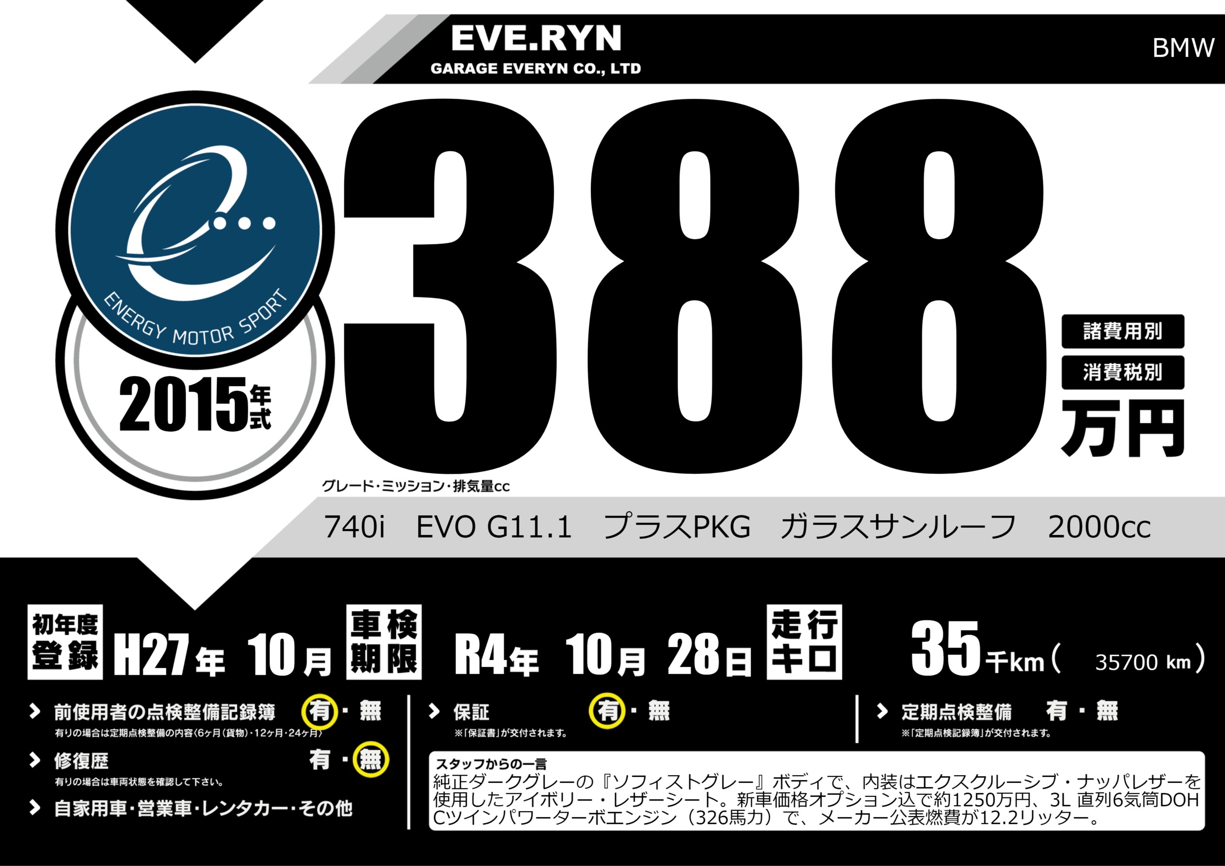 740i EVO G11.1 プラスPKG ガラスサンルーフ 2000cc |