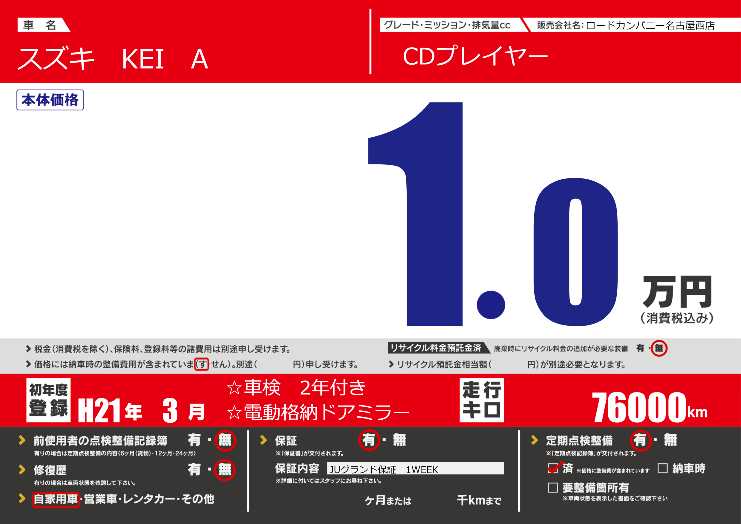 | 定期点検整備 | 定期点検整備あり 定期点検整備済み | ||