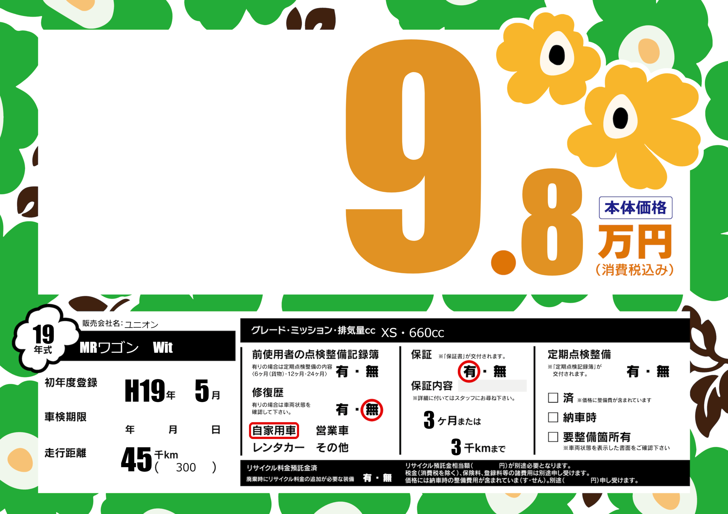 | 車名 | MRワゴン Wit | グレード ミッション 排気量 |