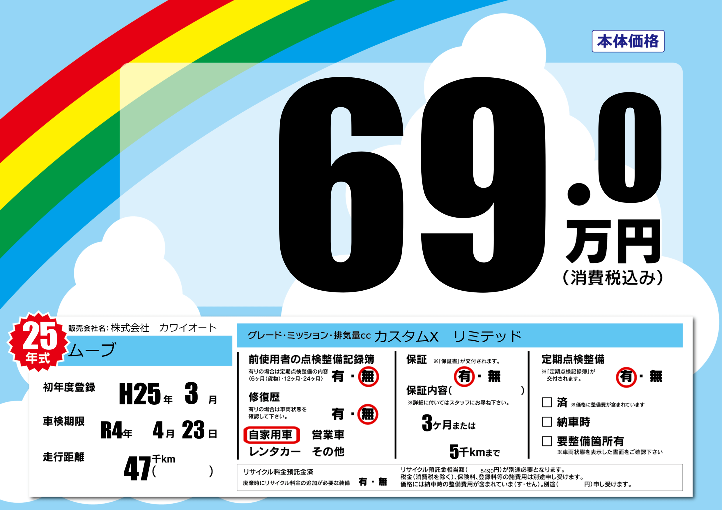 | 走行キロ | 4.7万km | 初年度登録 | H25年3月 |