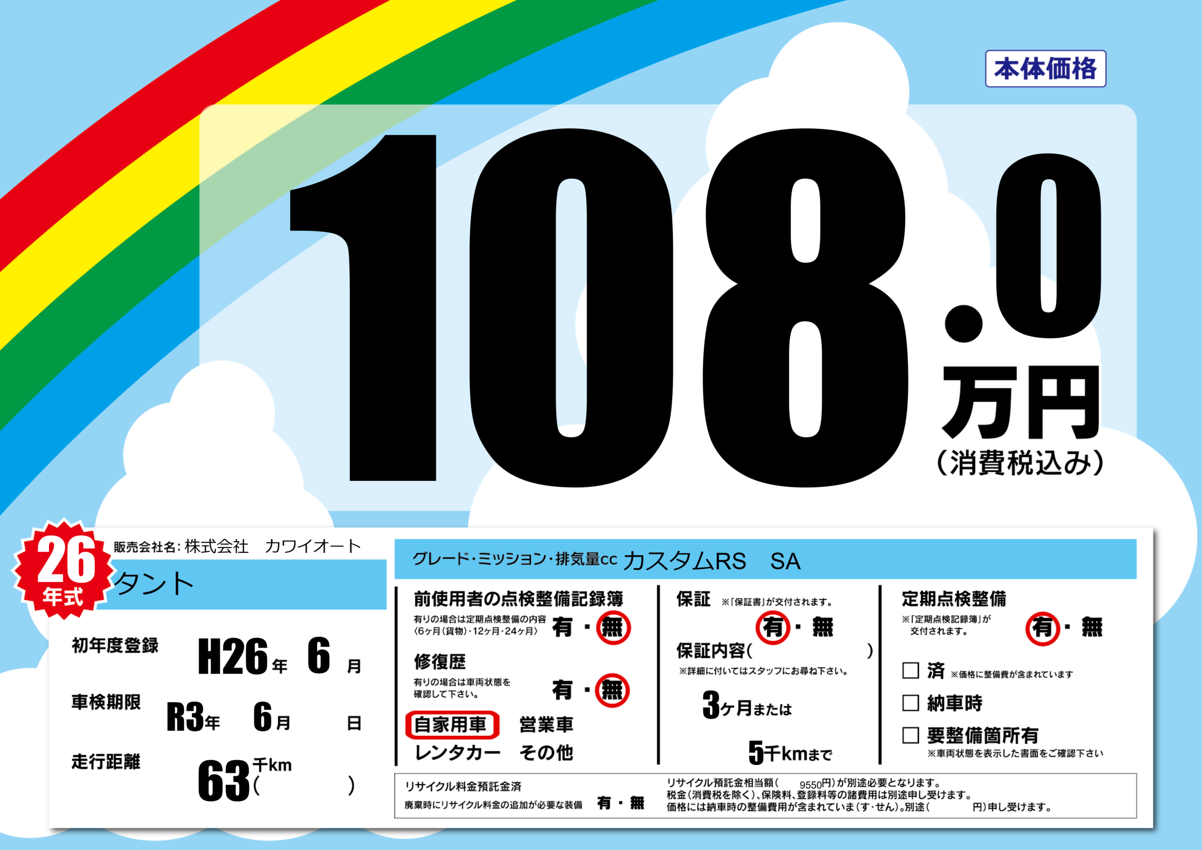 | 走行キロ | 6.3万km | 初年度登録 | H26年6月 |