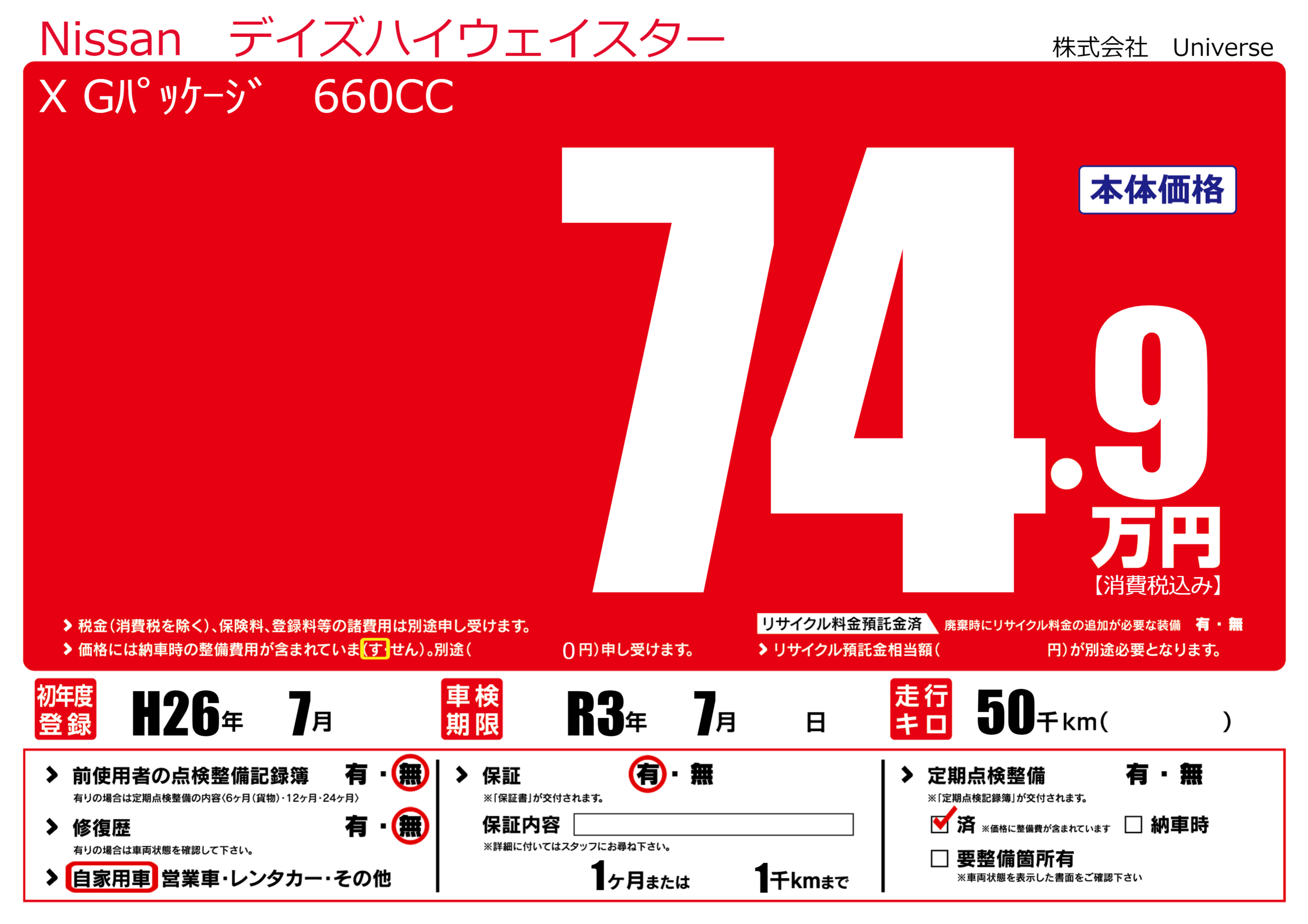 | 走行キロ | 5万km | 初年度登録 | H26年7月 |
