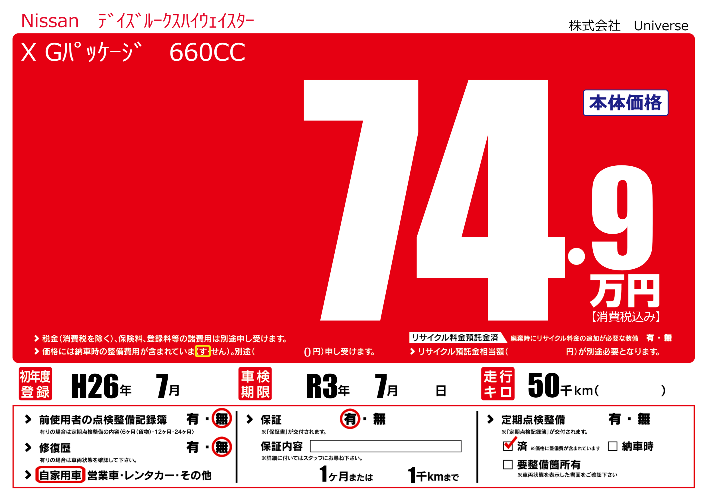 | 走行キロ | 5万km | 初年度登録 | H26年7月 |