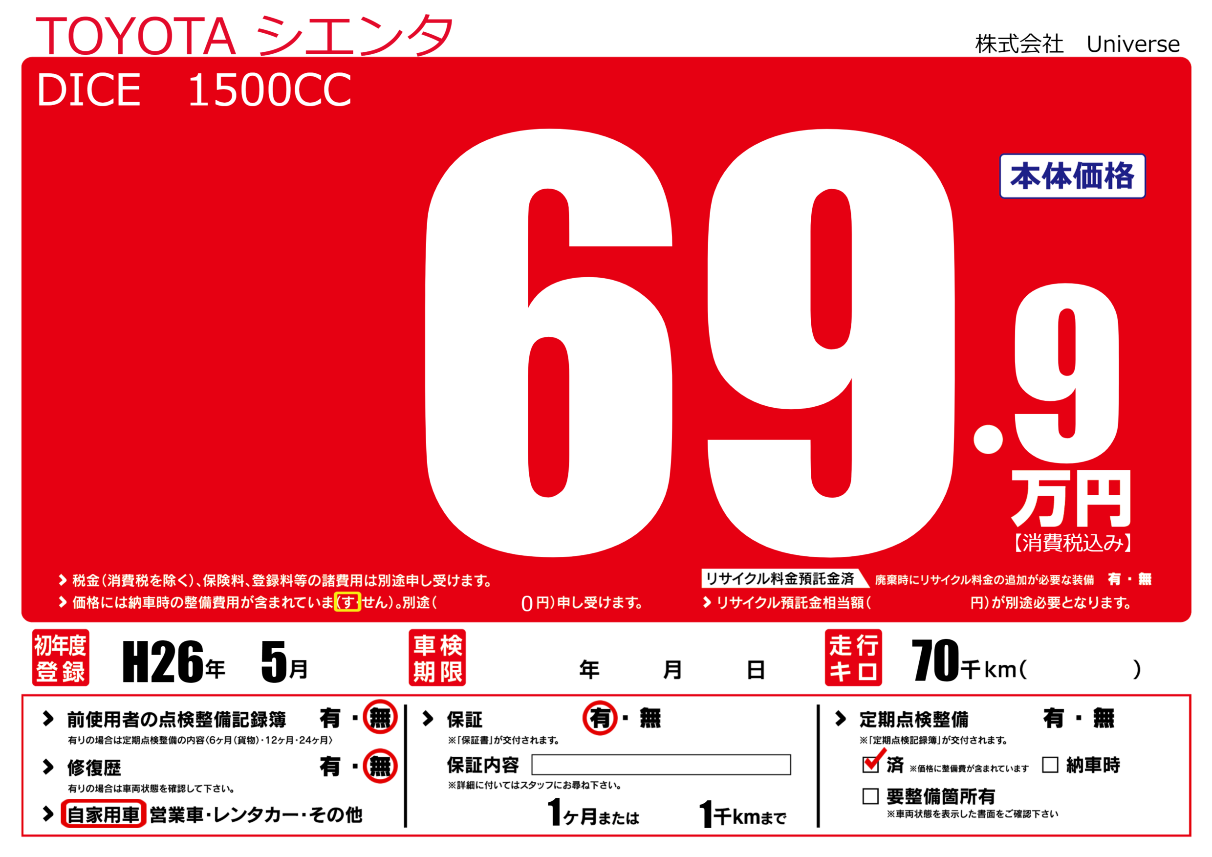 | 車名 | TOYOTA シエンタ | グレード ミッション 排気量 |