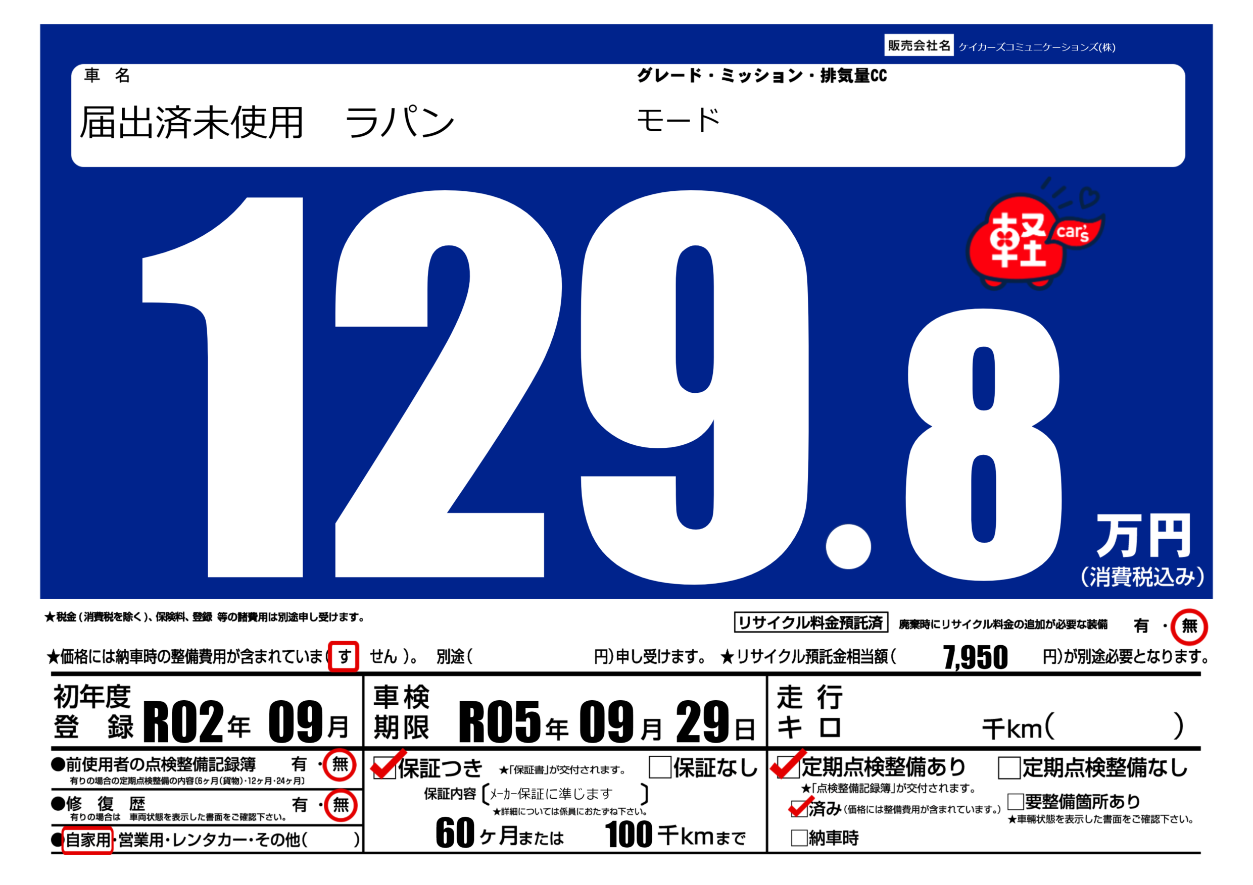 | 車名 | 届出済未使用 ラパン | グレード ミッション 排気量 |