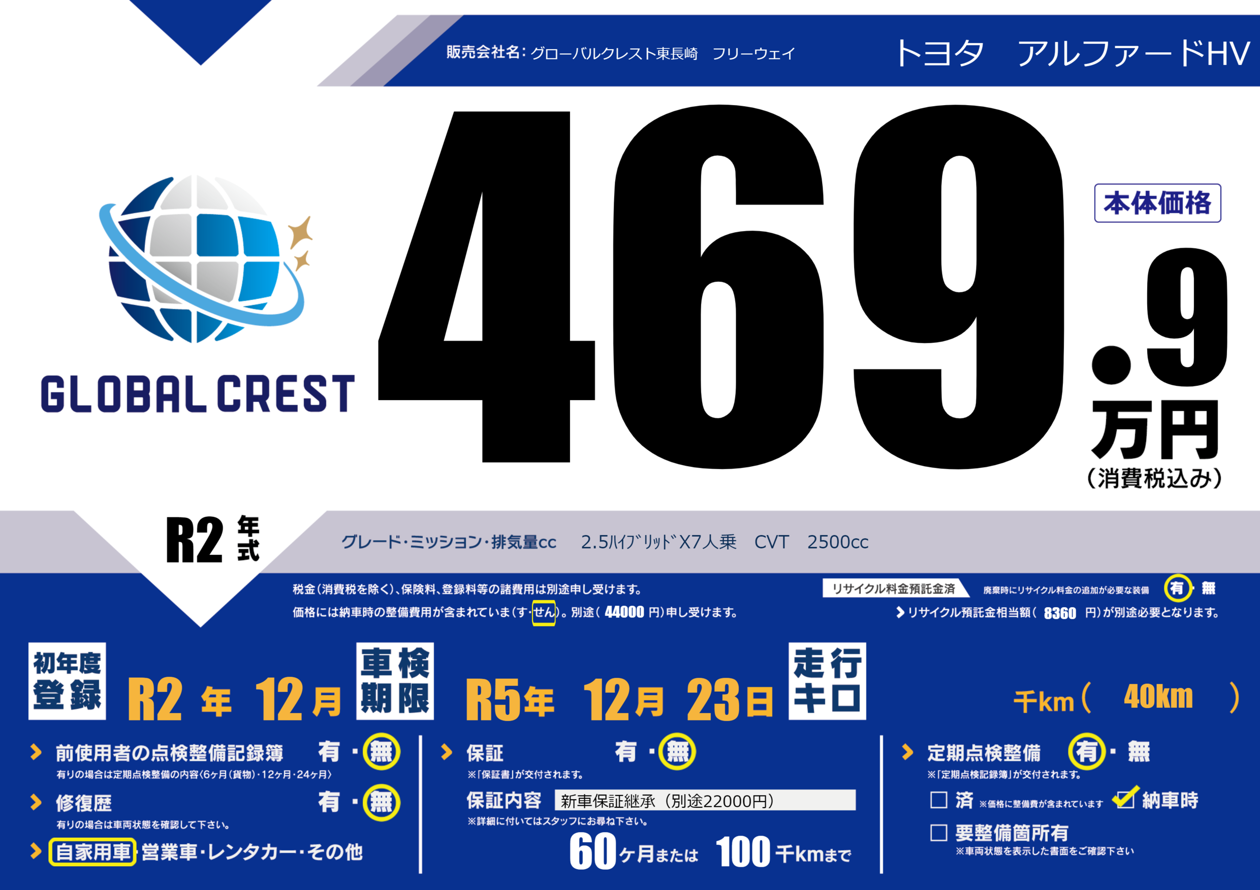 | 車名 | トヨタ アルファードHV | グレード ミッション 排気量 |