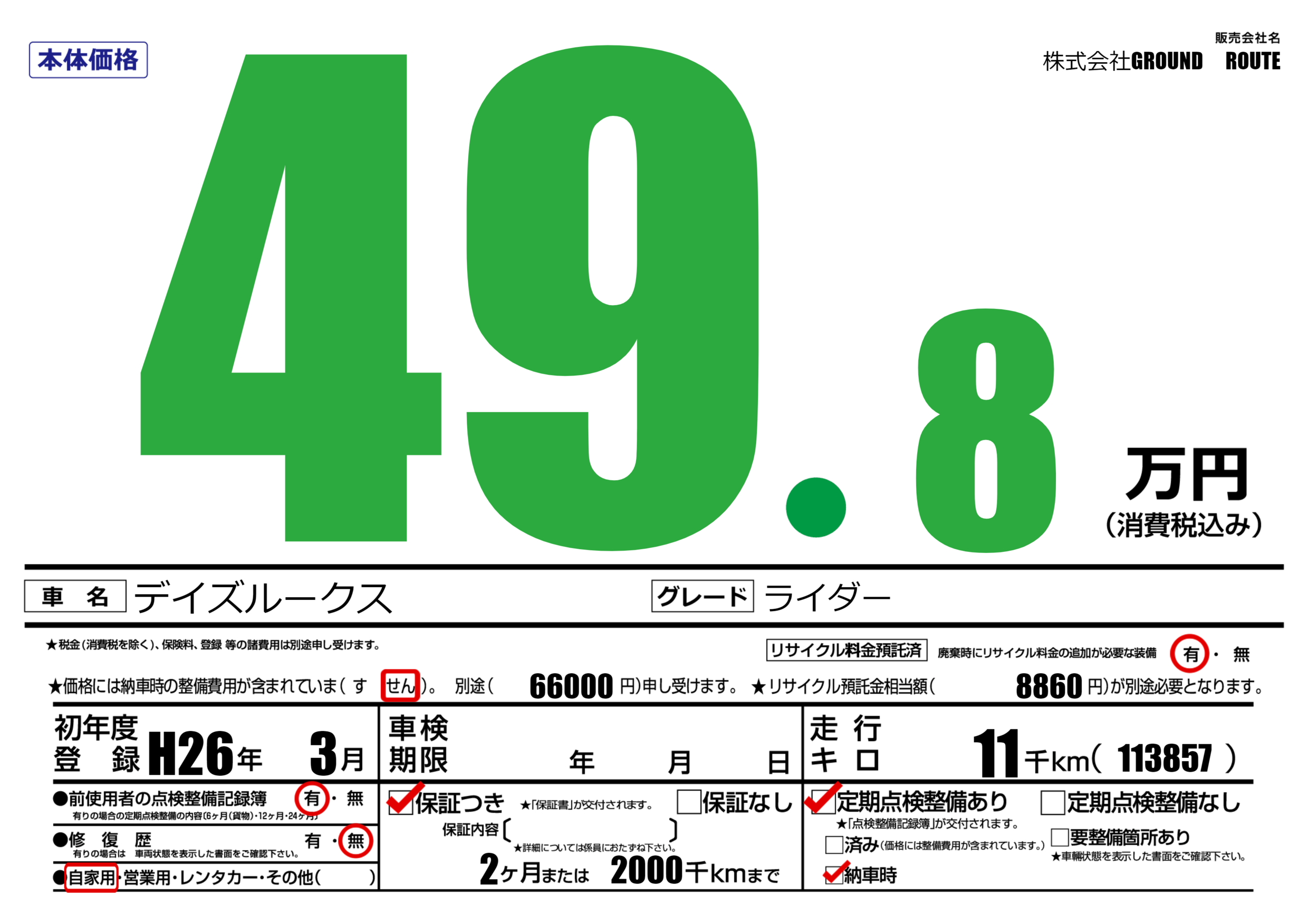 | 定期点検整備 | 定期点検整備あり 納車時あり | ||
