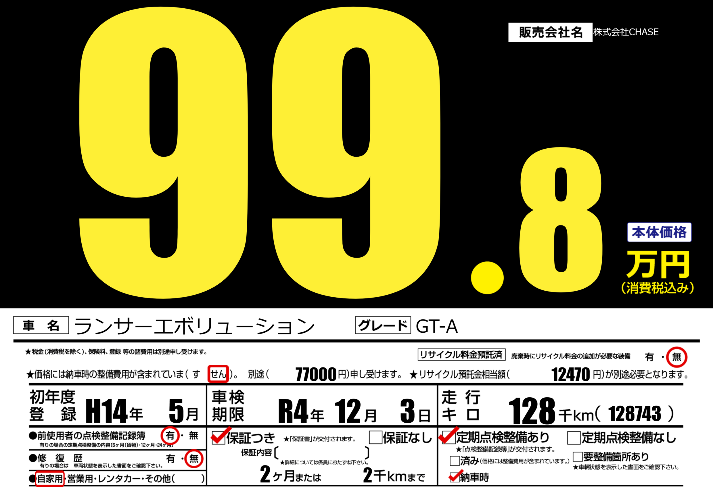 | 走行キロ | 12.8万km | 初年度登録 | H14年5月 |