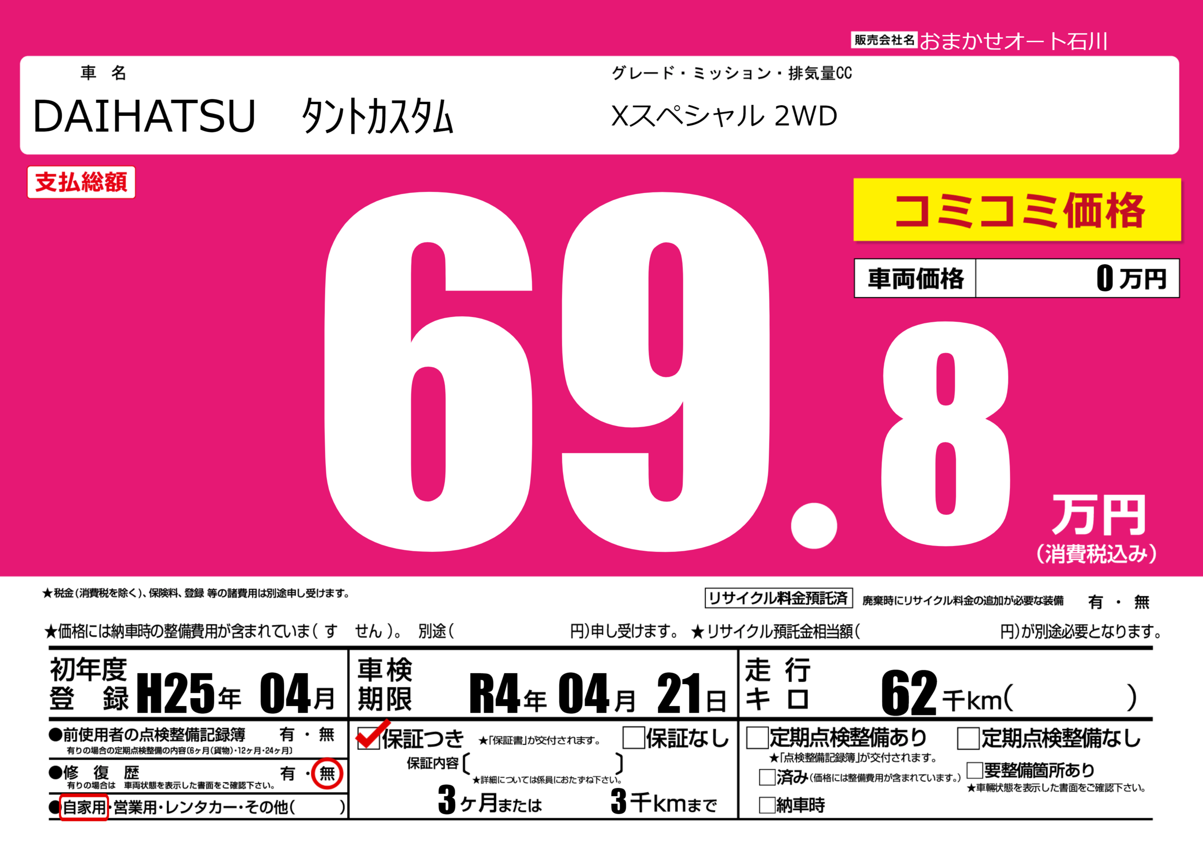 | 車名 | DAIHATSU タントカスタム | グレード ミッション 排気量 |