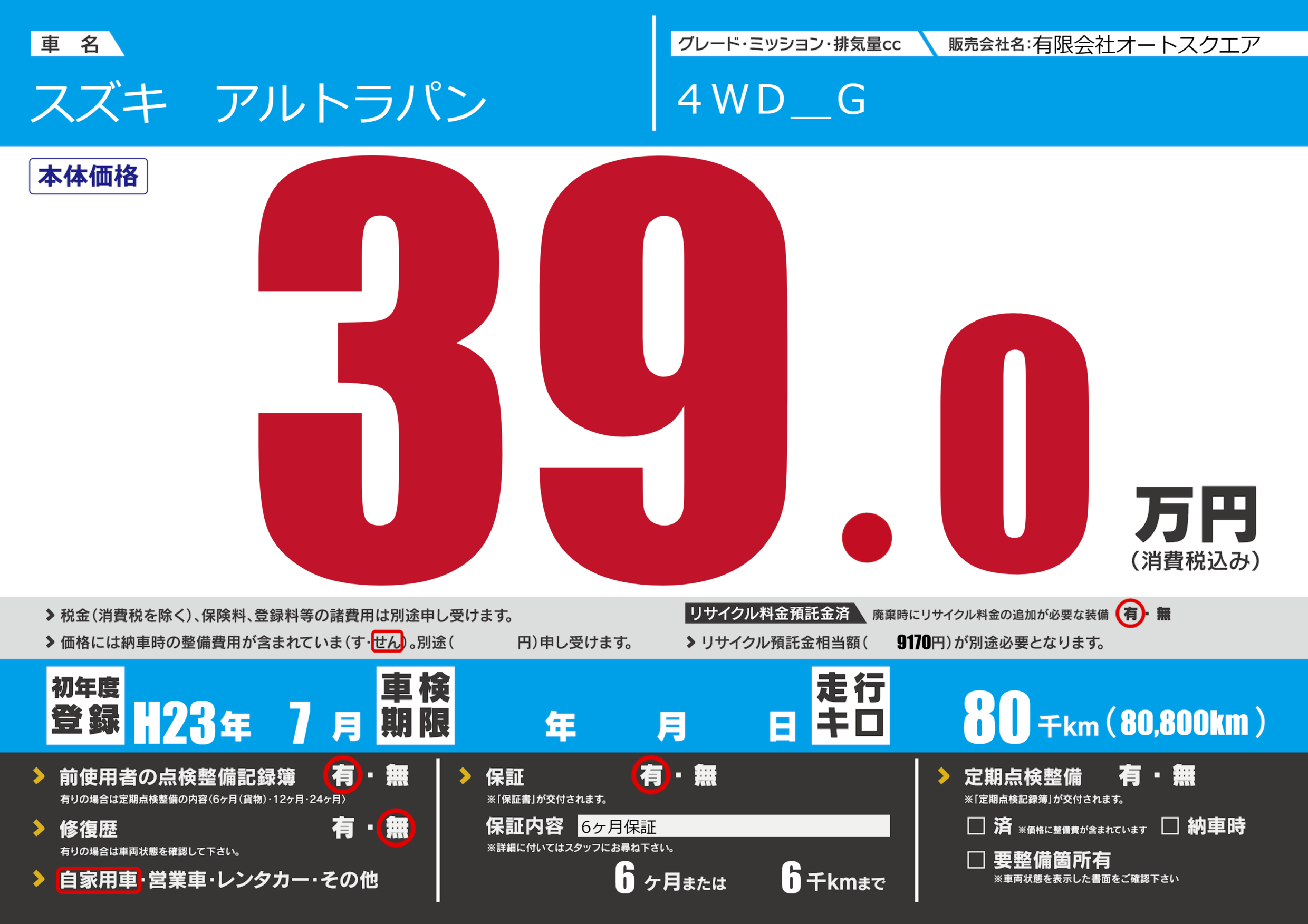 | 走行キロ | 8万km | 初年度登録 | H23年7月 |