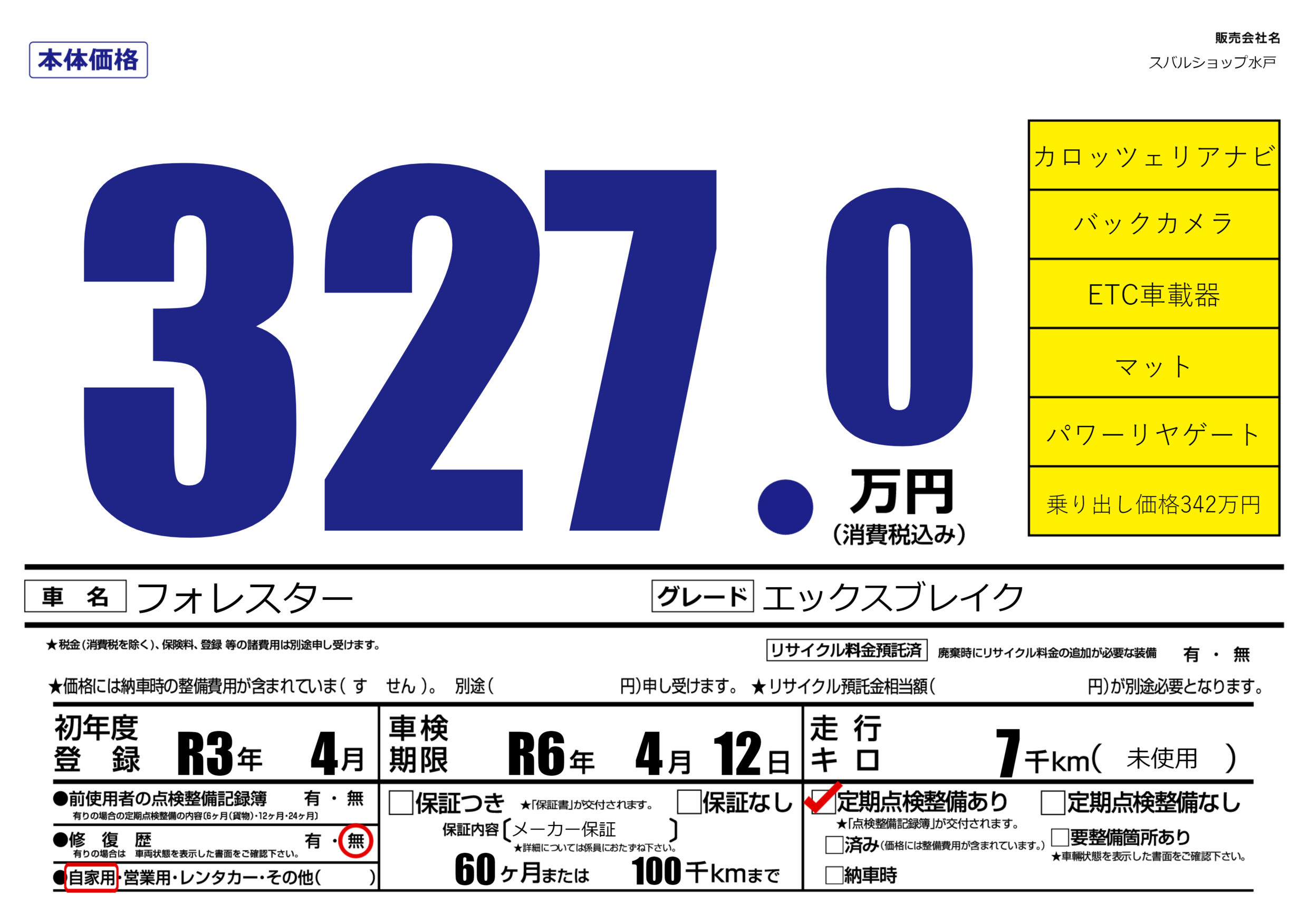 | 車名 | フォレスター | グレード ミッション 排気量 |
