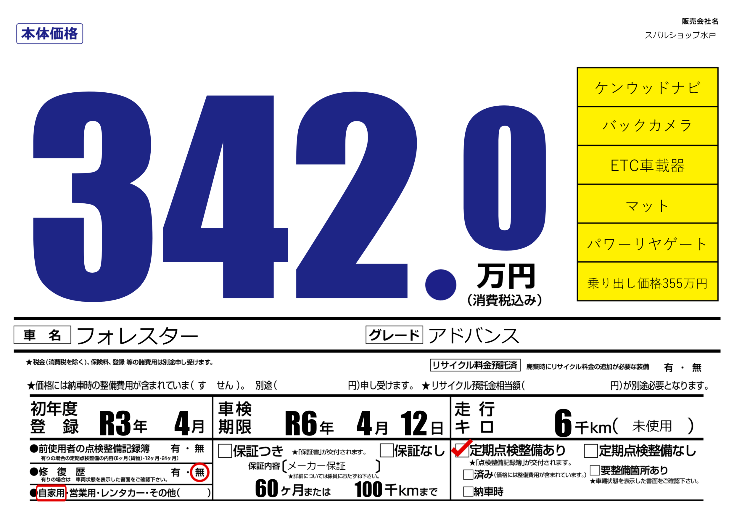 | 車名 | フォレスター | グレード ミッション 排気量 |