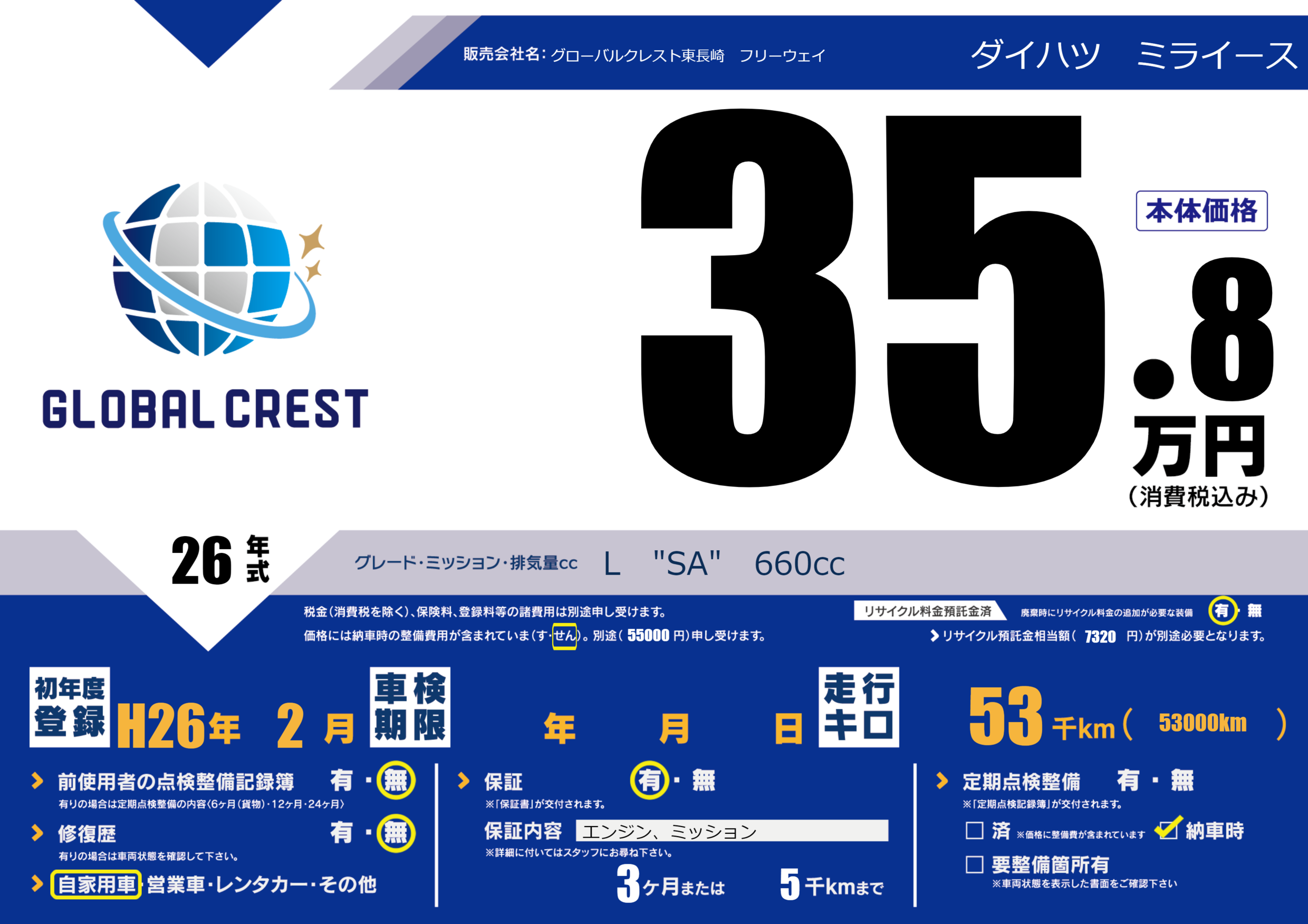 | 走行キロ | 5.3万km | 初年度登録 | H26年2月 |