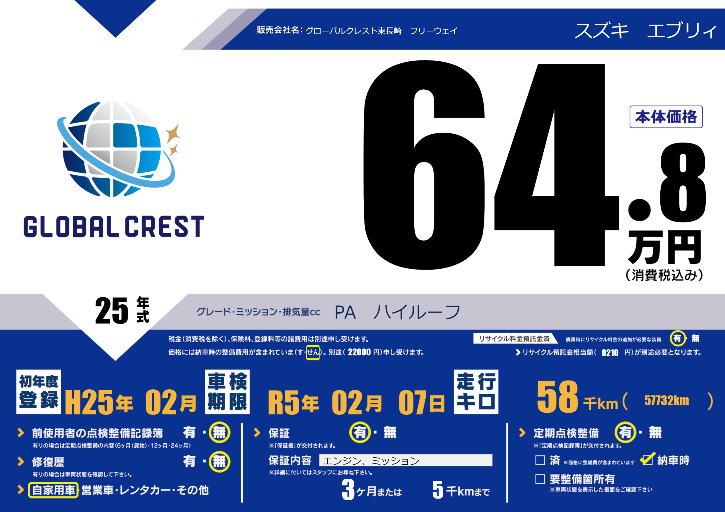 | 車名 | スズキ エブリィ | グレード ミッション 排気量 |