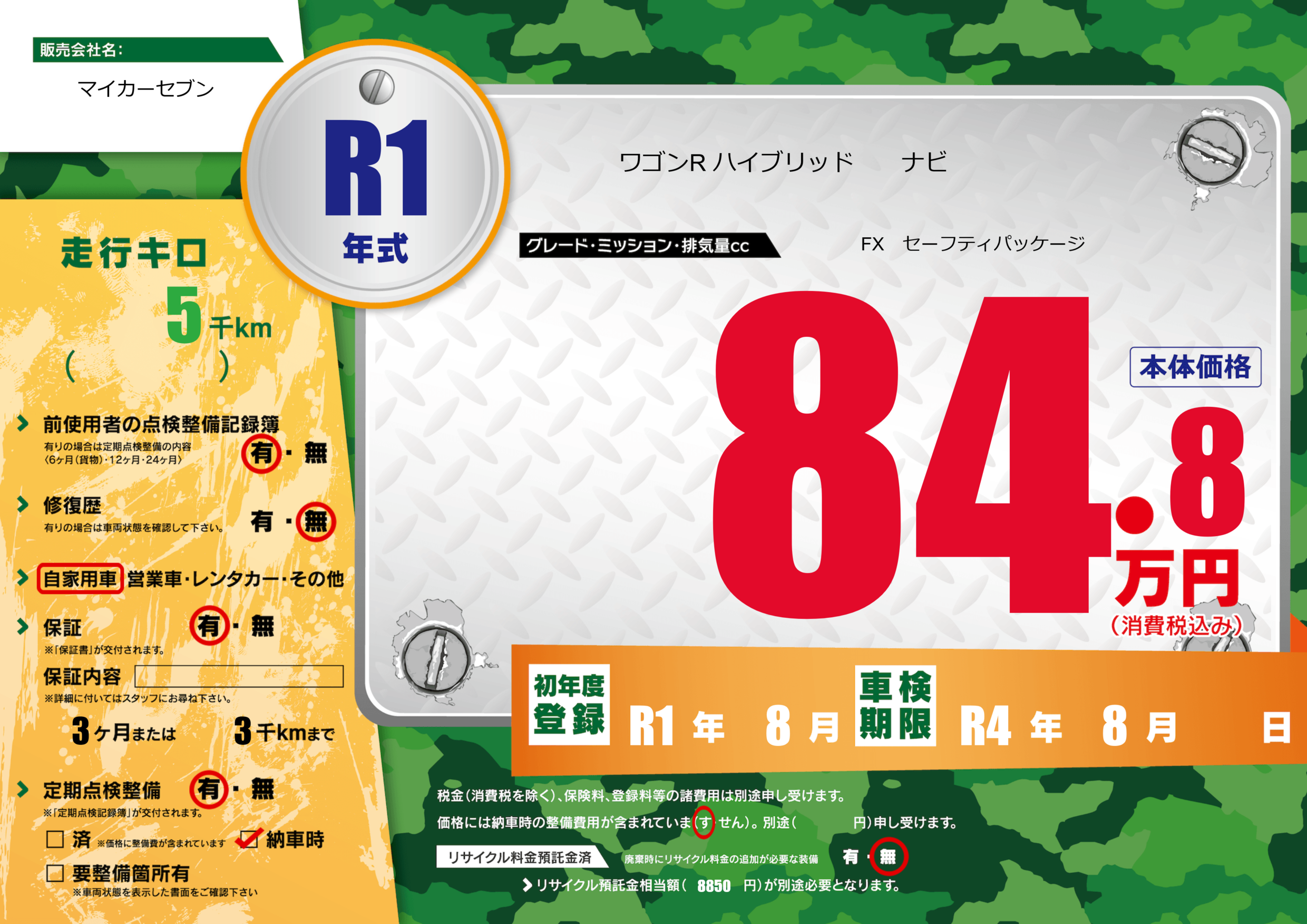 | 車名 | ワゴンR ハイブリッド ナビ | グレード ミッション 排気量 |