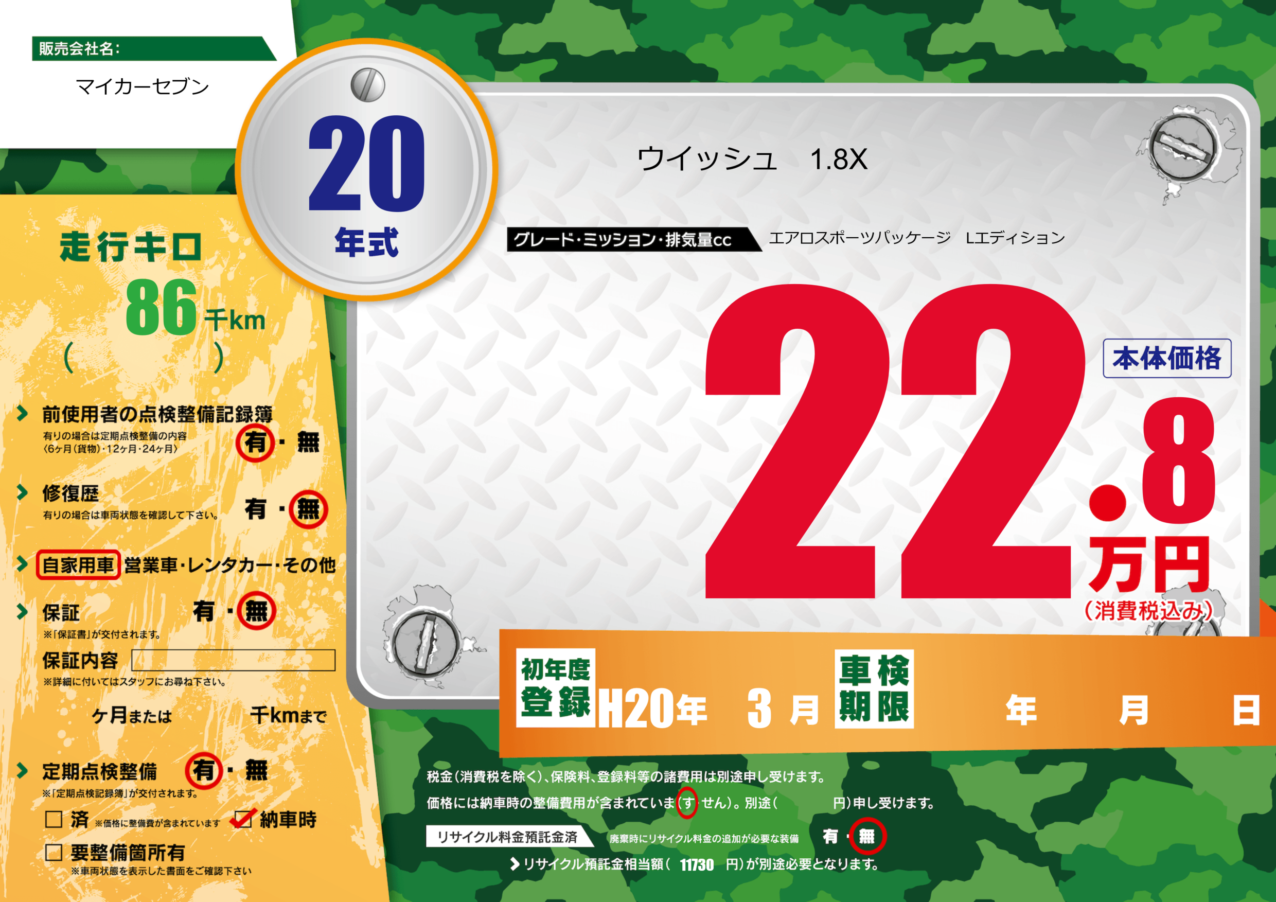 | 車名 | ウイッシュ 1.8X | グレード ミッション 排気量 |