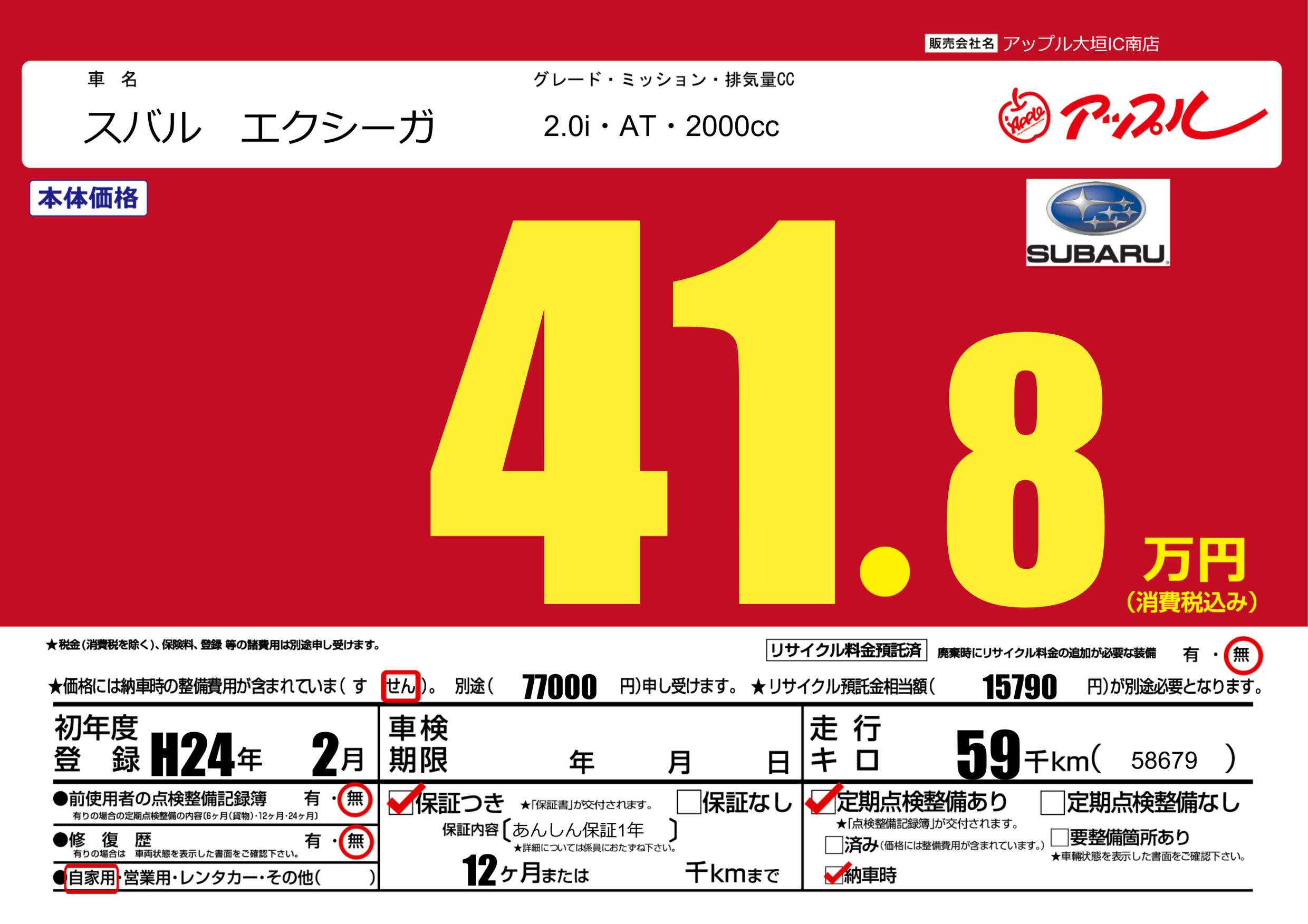| 車名 | スバル エクシーガ | グレード ミッション 排気量 |
