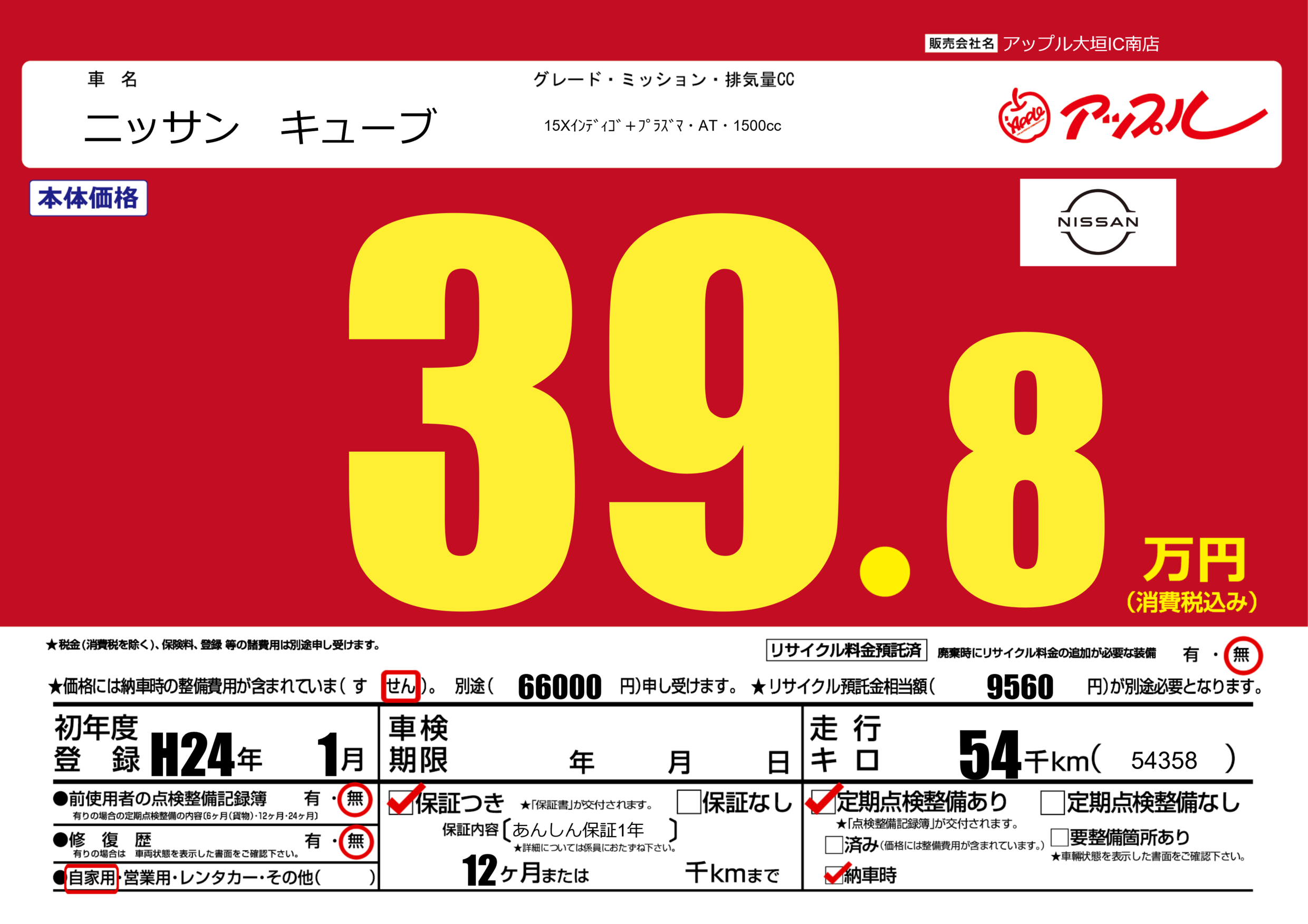 | 車名 | ニッサン キューブ | グレード ミッション 排気量 |