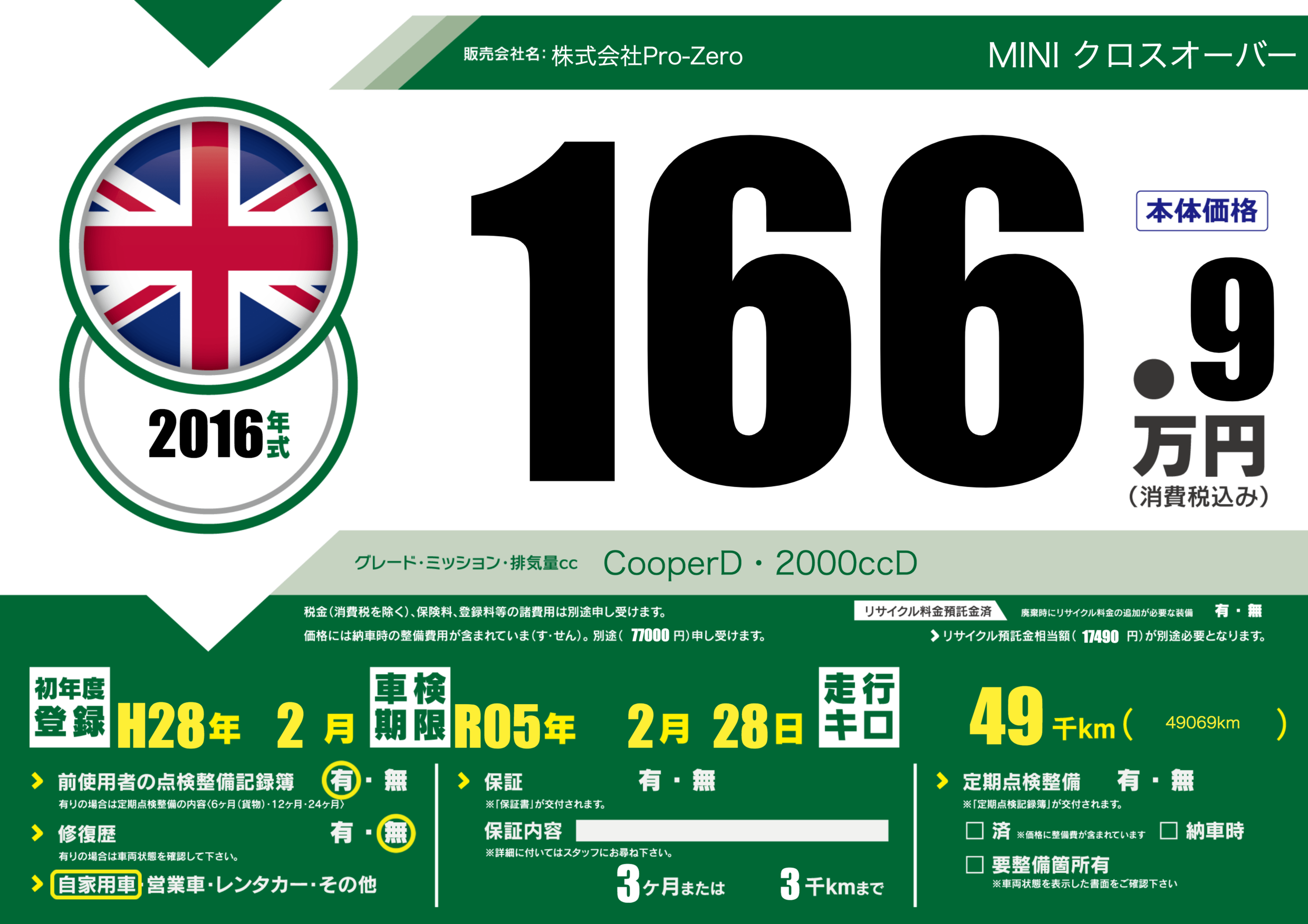 | 車名 | MINI クロスオーバー | グレード ミッション 排気量 |